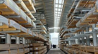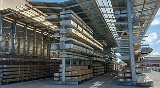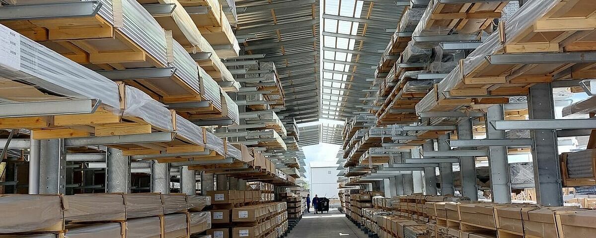 ALBIXON ha finalmente trovato una soluzione con scaffalature realizzate secondo le proprie necessità presso il produttore OHRA: Tre file di cantilever alti 7.300 millimetri consentono di sfruttare al meglio lo spazio disponibile. La capacità di carico per mensola è di 500 kg. Le colonne cantilever sono inoltre dotate di travi del tetto, alcune delle quali rivestite in PVC trasparente, per garantire una buona luminosità all’interno del corridoio di lavoro