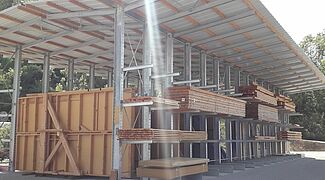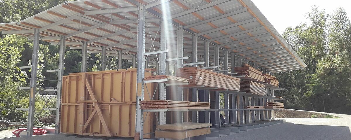 A tale scopo, OHRA ha montato due file di scaffalature lunghe 24 metri. Sia i bracci cantilever che le basi sono rivolte verso l'esterno. Le colonne alte 5,51 metri, sostengono travi del tetto lunghe 3,2 metri su entrambi i lati. Le scaffalature sono orientate in modo che tra di loro si crei un'area di stoccaggio coperta, larga circa 6 metri. Grazie al fatto che le basi delle scaffalature sono rivolte solo verso l'esterno è possibile collocare gli elementi prefabbricati. Sulle pareti esterne, le mensole cantilever lunghe 1,2 metri con una capacità di carico di 800 chilogrammi formano tre (o quattro) piani di stoccaggio coperti in cui sono sistemate le travi e il legname da costruzione.