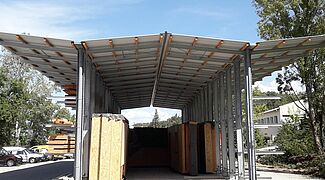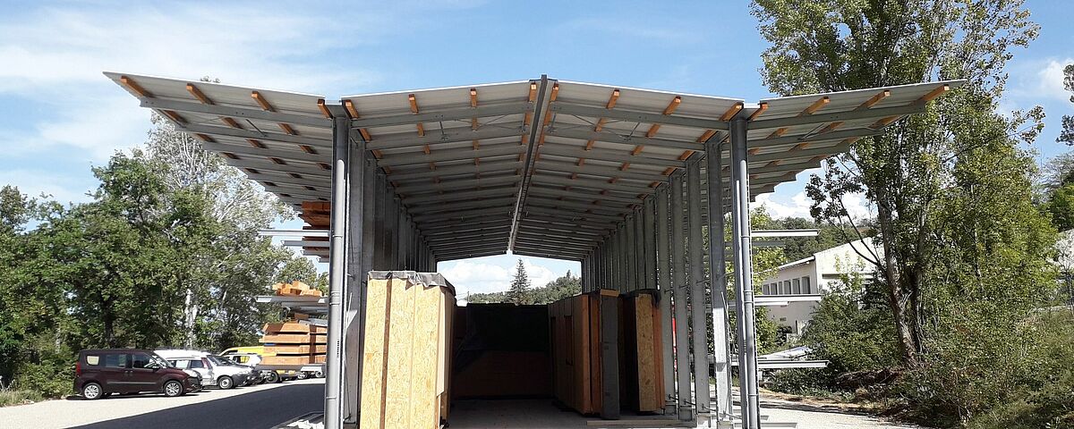 Anche nella progettazione del nuovo magazzino, Bati-Nature ha seguito la propria strada: Ciò dovrebbe creare ulteriori capacità di stoccaggio per legno da costruzione, travi e altri materiali in legno, nonché spazio per gli elementi a parete alti e larghi diversi metri, realizzati con telai in legno e isolati con paglia. Invece di costruire convenzionalmente un capannone per gli elementi a parete e installare scaffali separati per i materiali in legno, l'azienda ha unito le due soluzioni con il supporto di Ohra.