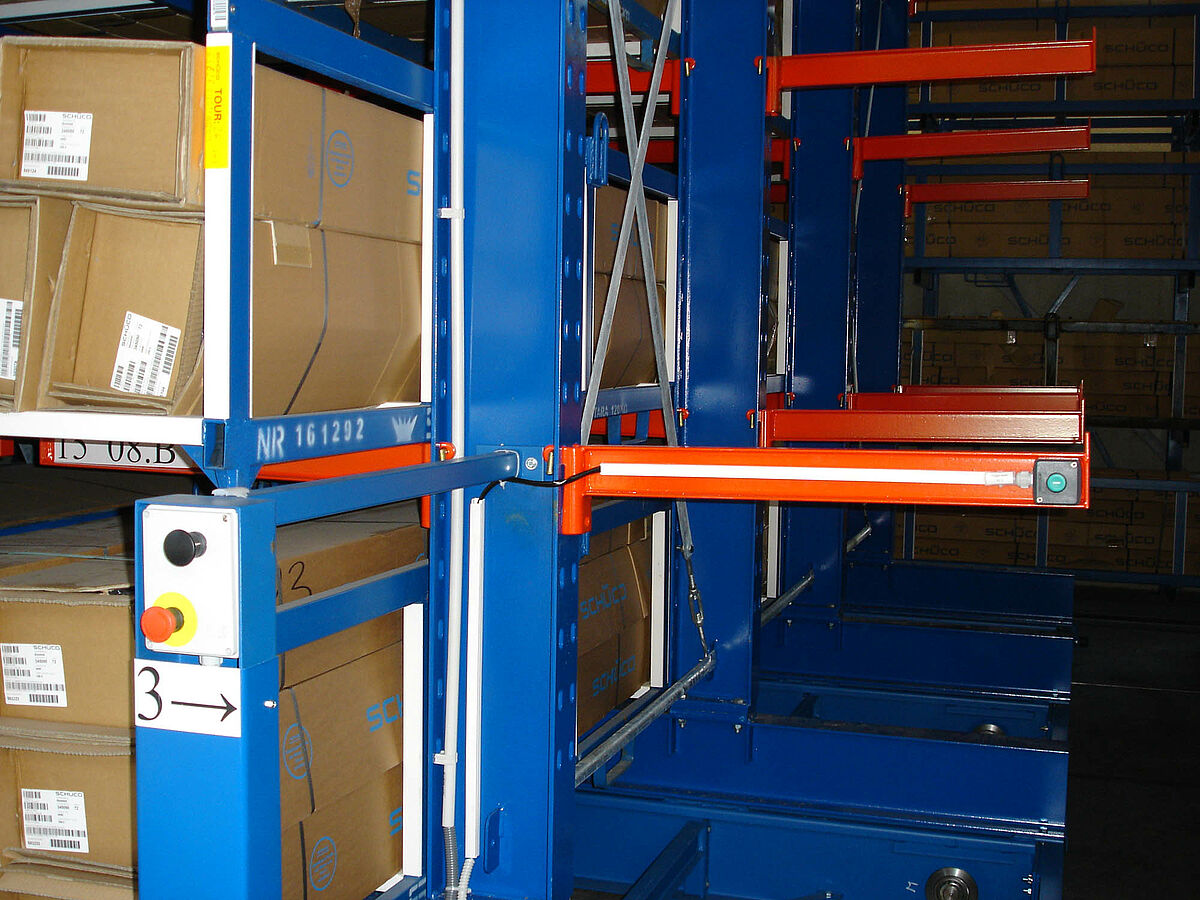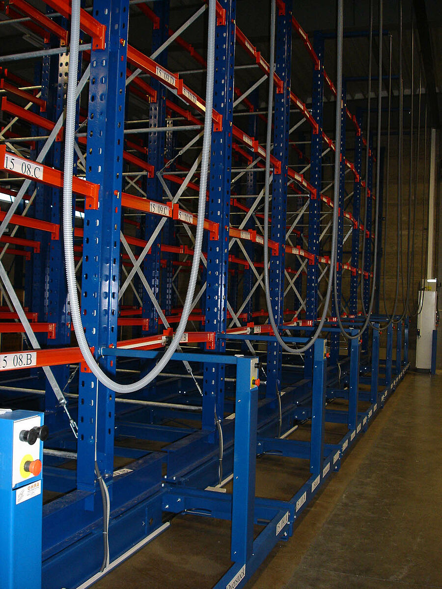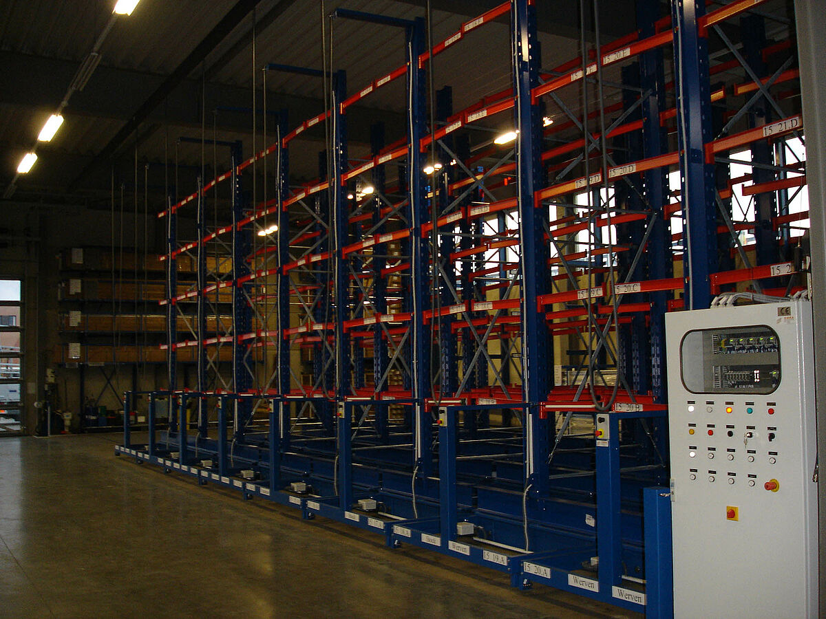 Durante i colloqui con il cliente sono state elaborate varie possibilità per il magazzinaggio razionale dei prodotti. La soluzione ottimale era rappresentata da scaffali con bracci a sbalzo su carrello. Con tale sistema di magazzinaggio è possibile realizzare su superfici molto ridotte un elevato volume di magazzino. I singoli corridoi tra le varie righe dello scaffale sono stati studiati in modo che gli scaffali che si trovano lateralmente all’impianto potessero essere comandati anteriormente. Tale soluzione non sarebbe stata possibile con scaffali ad installazione statica.