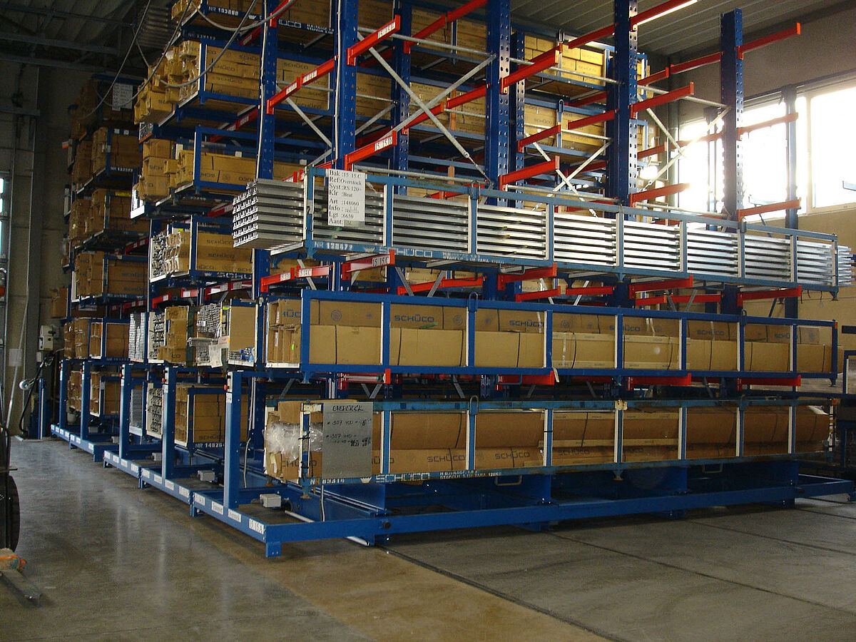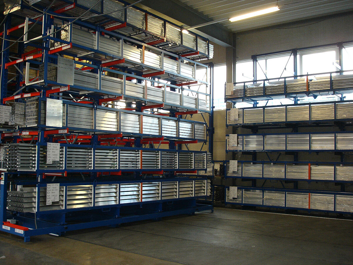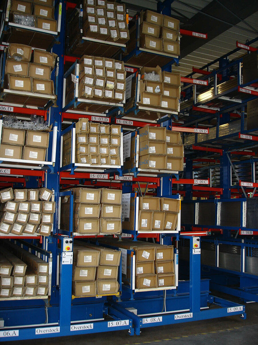 Durante i colloqui con il cliente sono state elaborate varie possibilità per il magazzinaggio razionale dei prodotti. La soluzione ottimale era rappresentata da scaffali con bracci a sbalzo su carrello. Con tale sistema di magazzinaggio è possibile realizzare su superfici molto ridotte un elevato volume di magazzino. I singoli corridoi tra le varie righe dello scaffale sono stati studiati in modo che gli scaffali che si trovano lateralmente all’impianto potessero essere comandati anteriormente. Tale soluzione non sarebbe stata possibile con scaffali ad installazione statica.