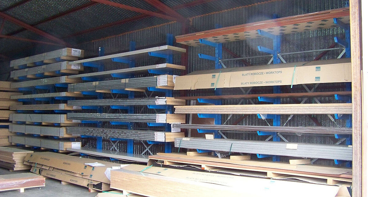 Un ulteriore magazzino alloggia i piani di lavoro della profondità di 600 mm che nei rispettivi pacchi pesano da 300 a 400 kg. Questo magazzino è dotato di scaffalature cantilever di OHRA. Lo stesso vale per un quarto magazzino che rifornisce di materiale la falegnameria interna. Qui sono immagazzinati, fra l'altro, pacchi di pannelli OSB che raggiungono anche 1200 kg di peso. Le scaffalature cantilever di OHRA in tale contesto offrono un'elevata flessibilità, poiché i bracci orizzontali sono agganciati nei montanti degli scaffali in modo variabile. E quindi i dipendenti di Damar possono modificare velocemente l'altezza dei livelli di stoccaggio - completamente senza attrezzi.