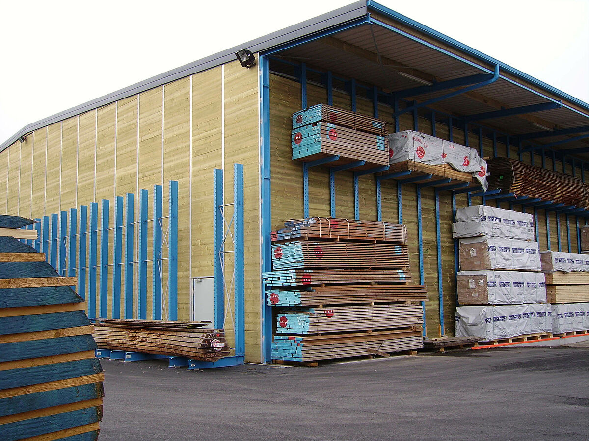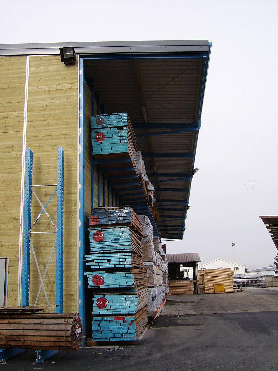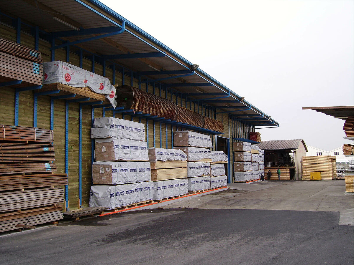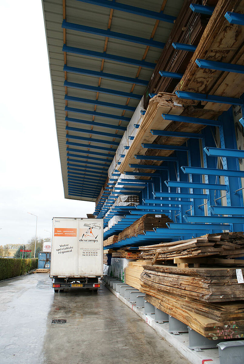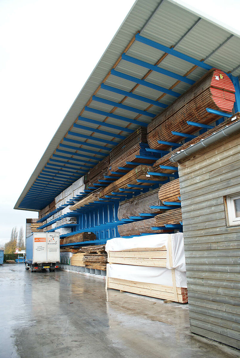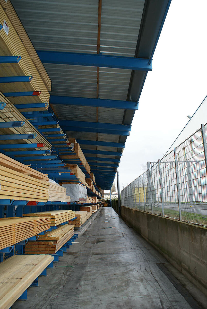 Per la soluzione di questi problemi di magazzino il cliente ora poteva scegliere tra una struttura tradizionale o la struttura a scaffali di OHRA. Considerando le problematiche descritte, Decamps ha optato per la soluzione di OHRA. Con questa variante è stata realizzata la tettoia e al tempo stesso sono state potenziate le capacità di stoccaggio. Grazie all'impiego di robusti bracci, anche la parte esterna del capannone con tettoia è stata utilizzata come magazzino per i prodotti che richiedono poca o nessuna protezione dagli agenti atmosferici. Sino a quel momento tali prodotti erano immagazzinati in un altro edificio.