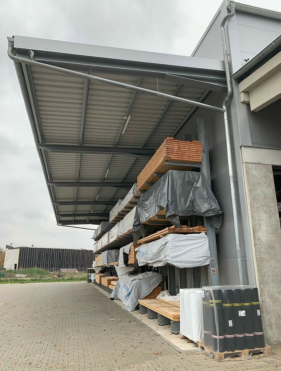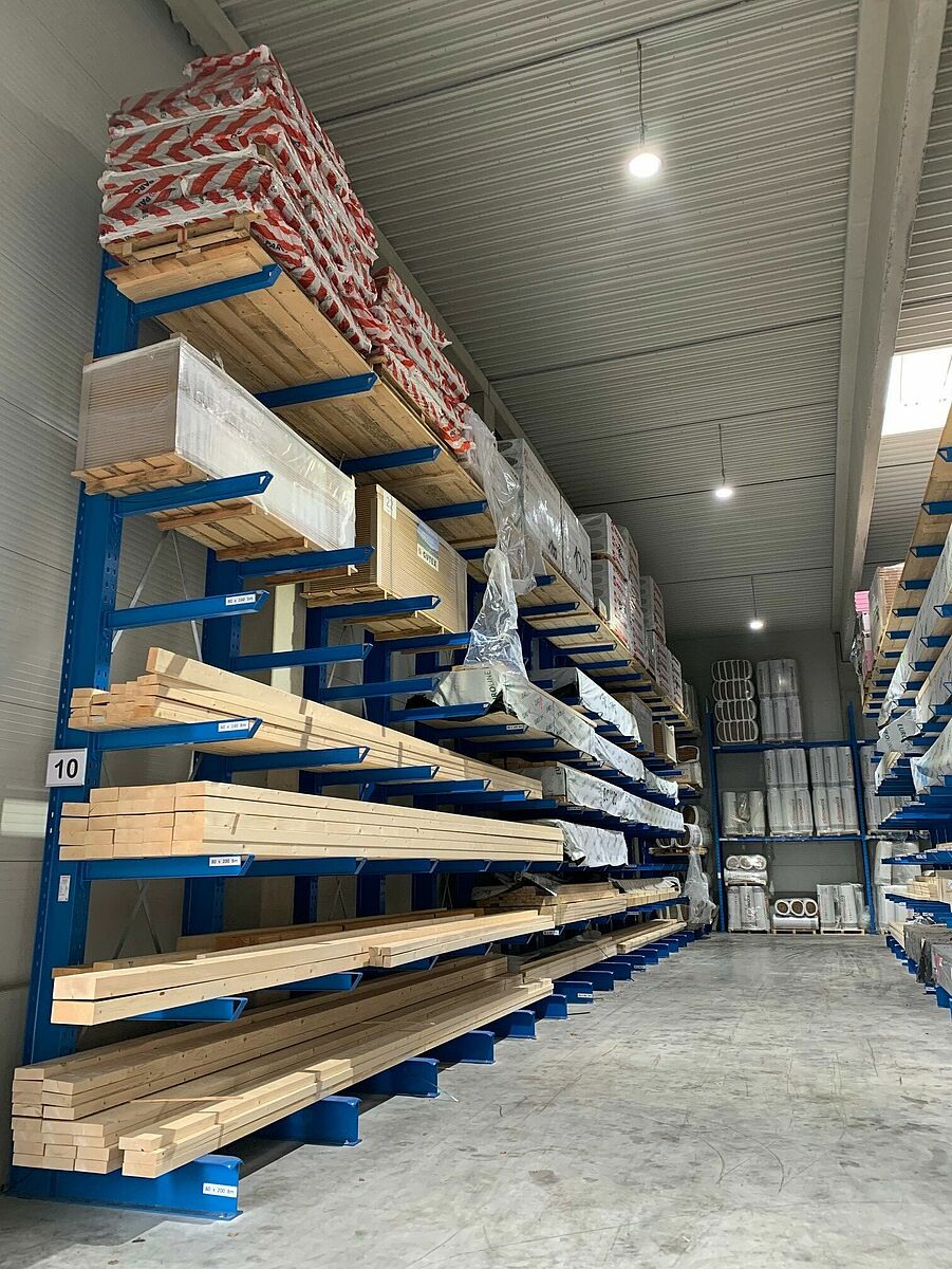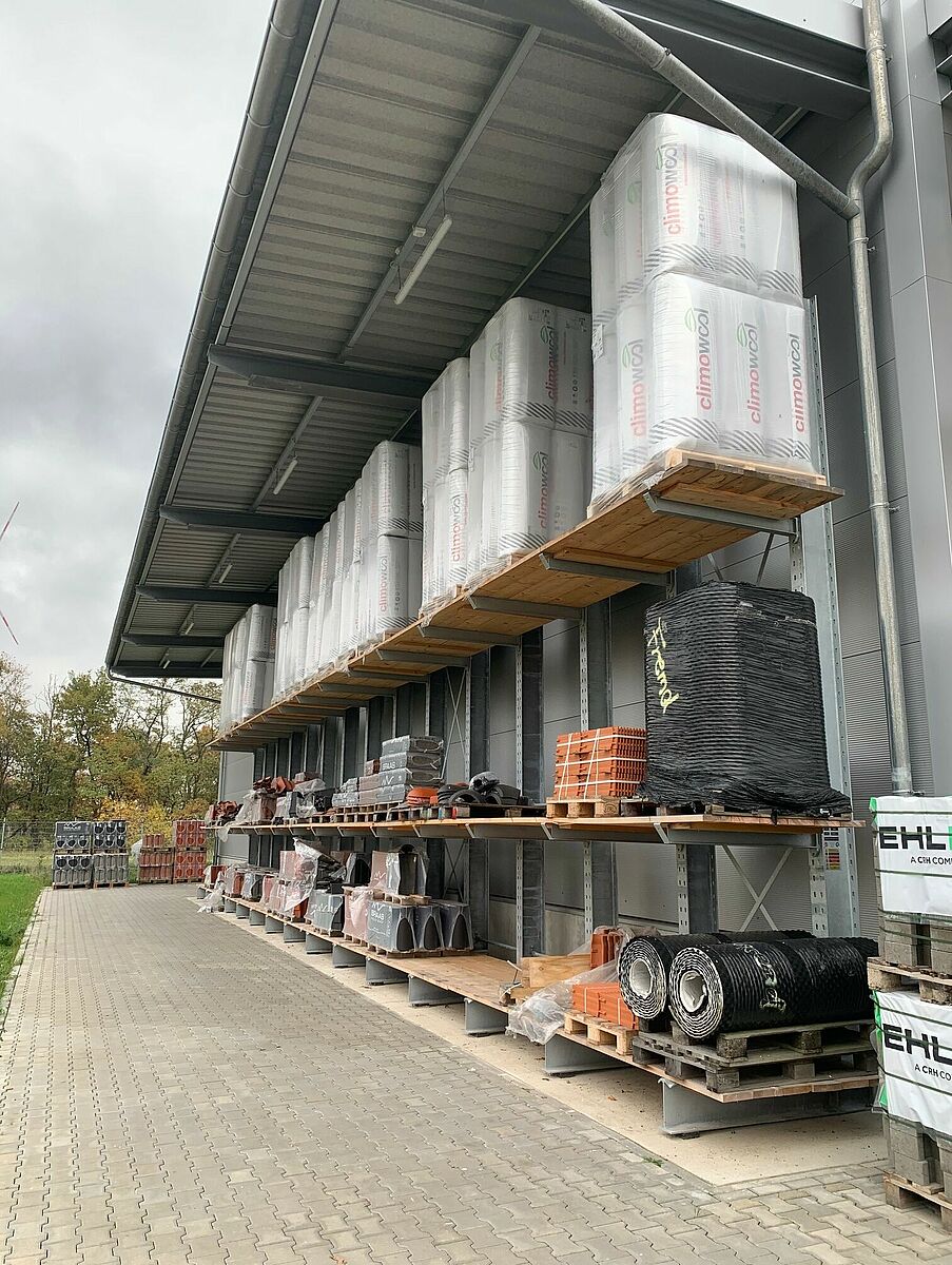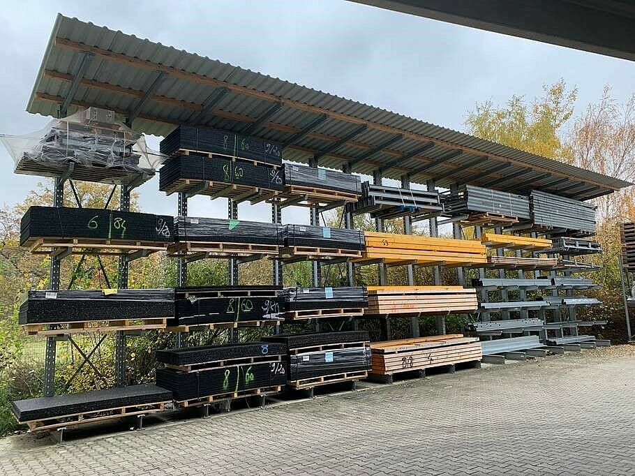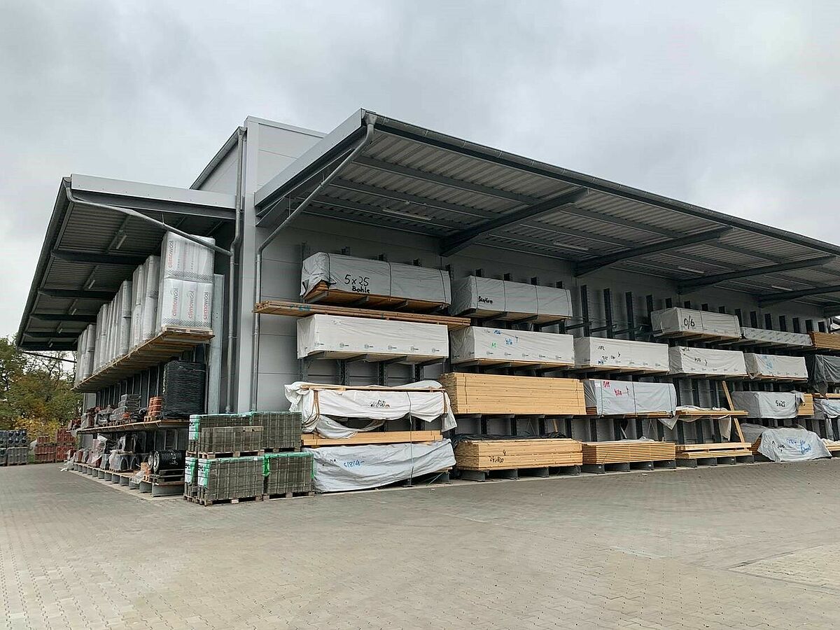 Il nuovo magazzino, alto 12 metri, è stato costruito su una superficie di 1.000 metri quadrati e offre ulteriore spazio per nuovi articoli, quali i pannelli per facciate, pannelli isolanti o per il legno massiccio da costruzione. Molti degli articoli ora comodamente e saldamente riposti sugli scaffali erano precedentemente riposti all'aperto e sul pavimento. Grazie alle scaffalature portapallet alte fino a 6,58 metri e alle scaffalature cantilever alte circa 7 metri, è stato possibile ampliare la capacità di stoccaggio e migliorare notevolmente l'accesso alla merce. OHRA ha installato complessivamente quattro file di scaffalature lunghe circa 18 metri, costituite da scaffalature portapallet e cantilever, nonché due scaffalature cantilever lunghe 25,5 metri con sei livelli di stoccaggio lungo le pareti interne della sala. Per materiali da costruzione meno sensibili sono disponibili altre scaffalature cantilever nell'area esterna.