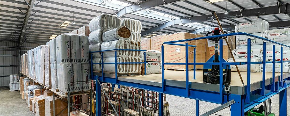 OHRA ha sviluppato un soppalco progettato su misura, adattando il carico utile, la posizione della scala e l'area di consegna delle merci alle caratteristiche specifiche del capannone esistente. Il soppalco ricopre un'area di dimensione di 33,8 x 8 metri, la capacità di carico è di 1.000 chilogrammi per metro quadrato ed è quindi assolutamente adeguata allo stoccaggio di pallet contenenti materiali isolanti. I supporti della struttura sono disposti secondo una griglia di 5 x 4 metri, la luce libera sotto trave è di 3,5 metri che rappresenta un ampio spazio di lavoro utilizzabile in modo flessibile. La pavimentazione è realizzata con pannelli di truciolare , la cui parte inferiore è verniciata di bianco. Insieme a una buona illuminazione e all'altezza generosa, il personale che lavora sotto il soppalco e ha a disposizione uno spazio di lavoro confortevole e piacevole.