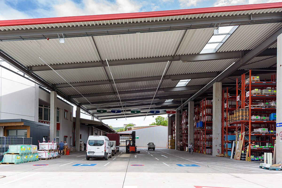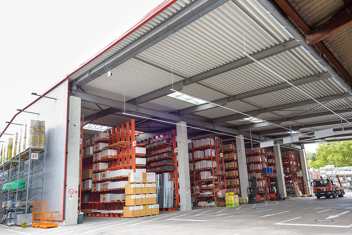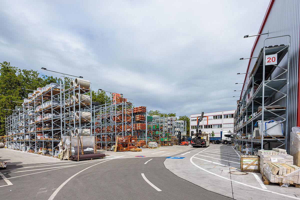 Poiché Lörrach si trova in una zona sismica 3, la struttura e le piastre di base delle nuove strutture OHRA sono state calcolate in modo da poter assorbire in modo sicuro le forze sismiche. Poiché le scaffalature OHRA sono realizzate con profili in acciaio laminati a caldo, e non lamiera, è possibile un'elevata capacità di carico. Poiché diverse file di scaffali nell'area esterna sono disposte su un dislivello, i tecnici OHRA hanno progettato una scaffalatura portapallet in cui sono stati montati supporti speciali. Inoltre, particolari piastre distanziatrici tra la base dello scaffale e il pavimento compensano le differenze di altezza. Anche gli scaffali nel magazzino aperto da una sola parte hanno richiesto un maggiore sforzo di calcolo, in quanto un lato del padiglione presenta una dimensione di apertura maggiore del 30%, e quindi le forze del vento dovevano essere incluse nel calcolo.