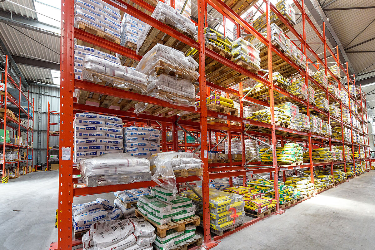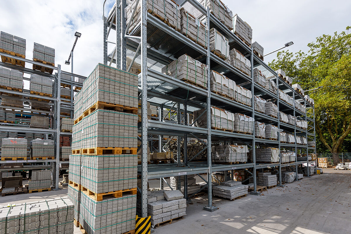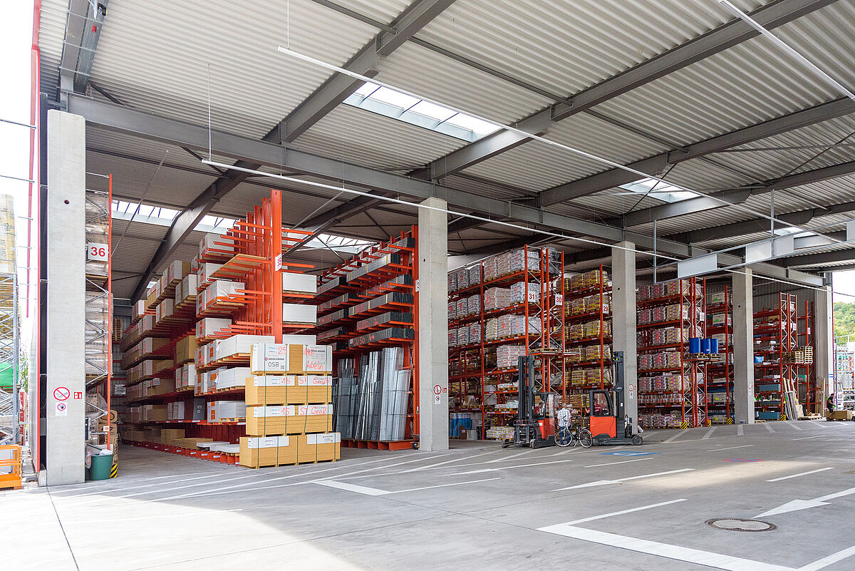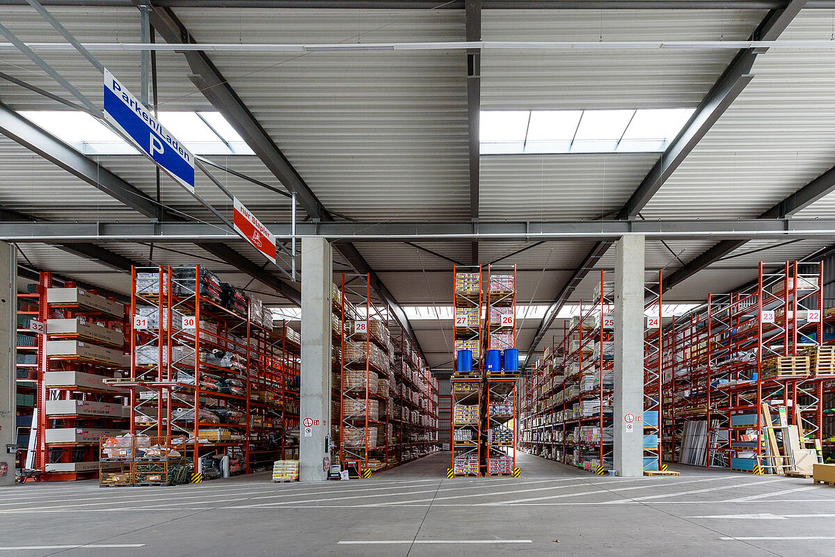 Poiché Lörrach si trova in una zona sismica 3, la struttura e le piastre di base delle nuove strutture OHRA sono state calcolate in modo da poter assorbire in modo sicuro le forze sismiche. Poiché le scaffalature OHRA sono realizzate con profili in acciaio laminati a caldo, e non lamiera, è possibile un'elevata capacità di carico. Poiché diverse file di scaffali nell'area esterna sono disposte su un dislivello, i tecnici OHRA hanno progettato una scaffalatura portapallet in cui sono stati montati supporti speciali. Inoltre, particolari piastre distanziatrici tra la base dello scaffale e il pavimento compensano le differenze di altezza. Anche gli scaffali nel magazzino aperto da una sola parte hanno richiesto un maggiore sforzo di calcolo, in quanto un lato del padiglione presenta una dimensione di apertura maggiore del 30%, e quindi le forze del vento dovevano essere incluse nel calcolo.