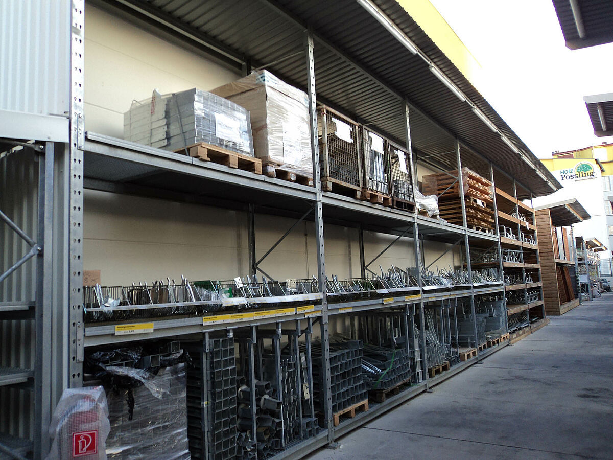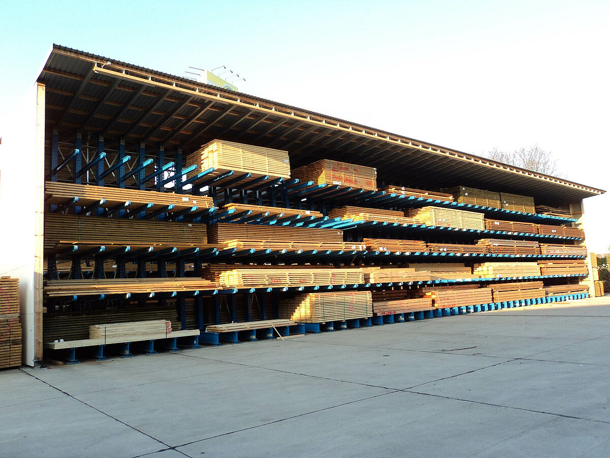 Qui il sistema OHRA ha potuto soddisfare anche richieste particolari del cliente nella configurazione dei sistemi di scaffalature. Così ora si possono immagazzinare, ad esempio, articoli di legno lunghi fino a 14 metri in scaffalature cantilever che, con una lunghezza dei bracci di 2.350 millimetri, consentono una profondità di stoccaggio doppia rispetto al normale. Le file di scaffalature cantilever alte fino a 6 metri e lunghe fino a 50 metri consentono inoltre un ottimale sfruttamento della superficie di stoccaggio. Per lo stoccaggio all'aperto le scaffalature cantilever sono inoltre dotate di una copertura nella quale, su richiesta del cliente, il braccio del tetto è stato realizzato della lunghezza di ben 4 metri. Le scaffalature portapallet sono state dotate da OHRA di diversi depositi intermedi per consentire l'immagazzinamento sicuro e salvaspazio anche di prodotti in sacchi, pietre, ecc.