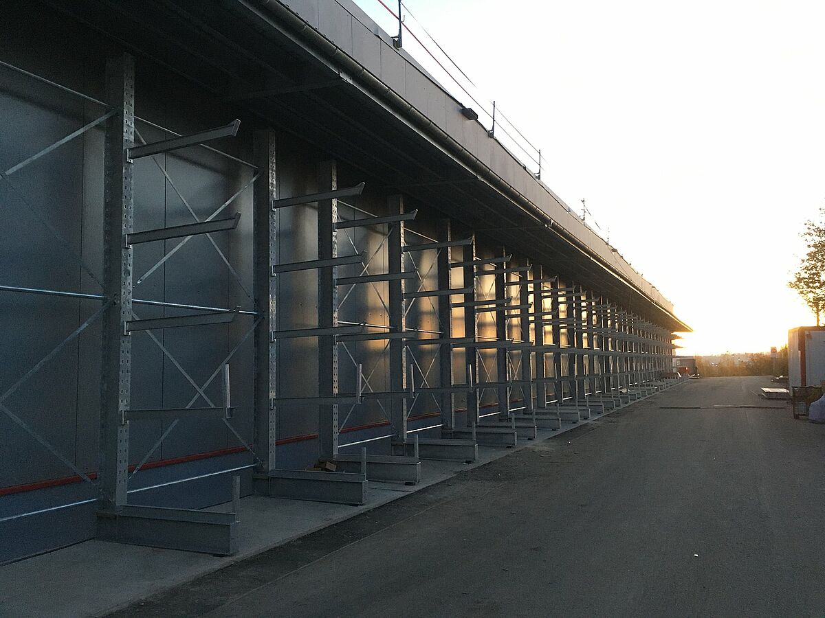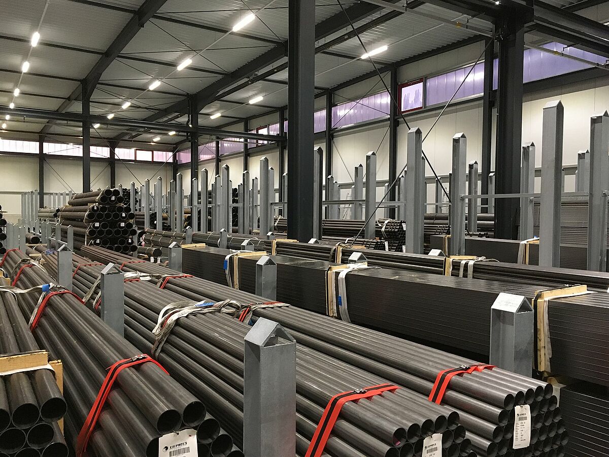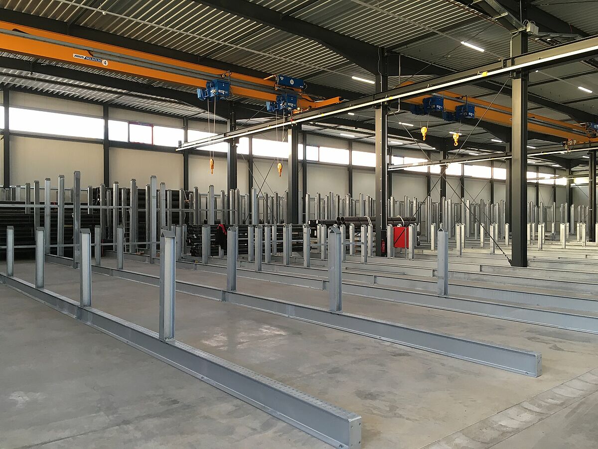 I tubolari lunghi e pesanti invece e i fasci sono stoccati nelle scaffalature a montanti, i profili leggeri sono collocati nei cantilever OHRA. Le scaffalature zincate alte circa 5 metri sono installate lungo le  pareti interne del deposito e poi intorno al perimetro esterno. Mensole di lunghezza 1,4 metri con capacità fino a 640 kg garantiscono il sicuro posizionamento dei profili.