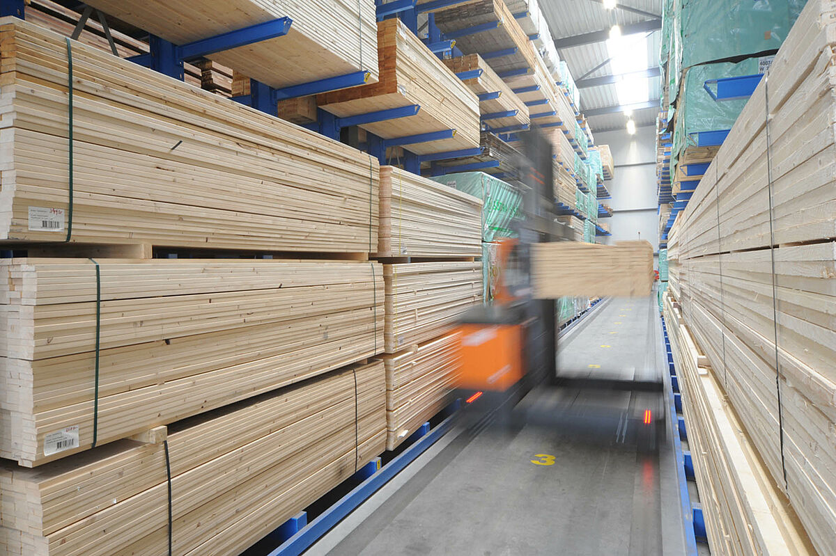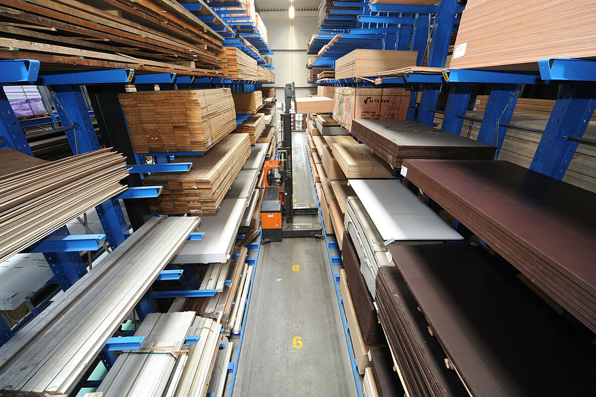 Per garantire uno stoccaggio ottimale di legno, lastre e materiali da costruzione, OHRA ha installato in soli due mesi undici file di scaffali cantilever della lunghezza di 36 metri e due file di scaffali portapallet. Con un'altezza degli scaffali di 9 metri, la superficie a disposizione viene sfruttata al meglio riducendo inoltre le distanze da percorrere con i carrelli elevatori a quattro vie. Le scaffalature portapallet, con scomparti larghi 2700 millimetri disposti su sei livelli, offrono complessivamente 462 posti. Nove piani di scaffali cantilever consentono l'immagazzinamento di pallet e legname lungo; la lunghezza dei bracci varia da 1.100 e 1.550 millimetri. Dal momento che ITS commercializza anche legname duro pesante, alcune zone delle scaffalature sono inoltre realizzate con scaffali per carichi pesanti.