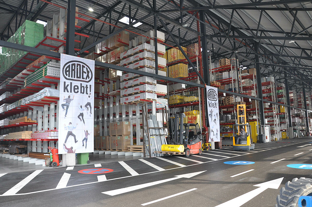 Qui vengono immagazzinati sia prodotti lunghi per i settori legname, ingegneria civile, orticoltura e architettura paesaggistica, sia merci pesanti dell'assortimento di pietre naturali o conglomerati cementizi. Inoltre, a seconda della stagione, qui vengono immagazzinati anche articoli, come ad esempio i tagliaerba, del grande magazzino di materiali per l'edilizia.