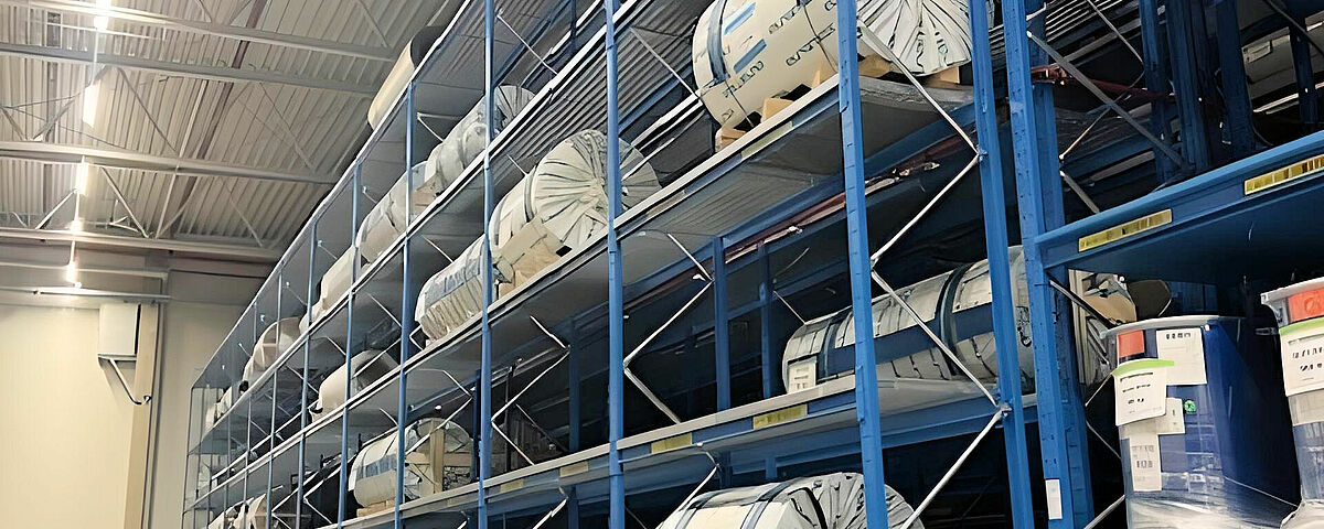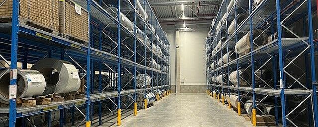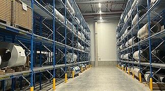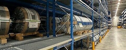 La compresenza di scaffalature con bracci a sbalzo e portapallet consente lo stoccaggio di materiali diversi come colle, bobine di alluminio e vetroresina, pacchetti di compensato, pavimenti in PVC o strisce di legno e poliuretano espanso. Un vantaggio degli scaffali OHRA realizzati con profili d’acciaio laminati a caldo è la loro elevata capacità di carico: alla Knaus Tabber, le scaffalature cantilever reggono, ad esempio, fino a 12 tonnellate per montante; la capacità di carico di un singolo braccio a sbalzo arriva a 1000 kg, anche all’ultimo piano di stoccaggio a 7,5 metri di altezza. Le bobine di vetroresina pesanti fino a 1,2 tonnellate e quelle di lamiera, che possono pesare anche 1,8 tonnellate, vengono invece stoccate nei portapallet. I ripiani in rete consentono uno stoccaggio flessibile, indipendentemente dal formato degli ausili per il caricamento delle bobine. Anche nelle scaffalature cantilever i ripiani in rete fanno in modo che si possano stoccare contenitori e supporti di stoccaggio di vario genere.