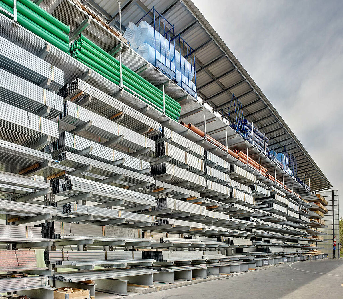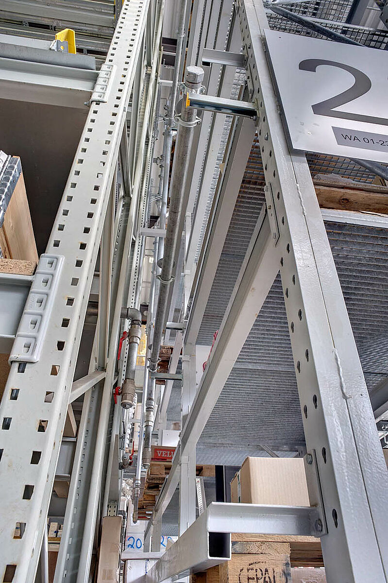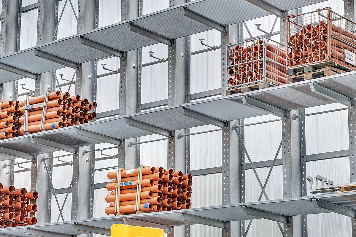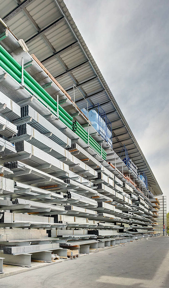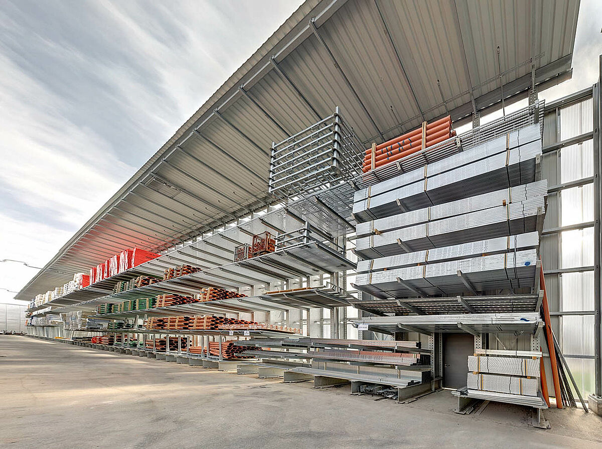 Sono stati scelti ad es. scaffali con bracci a sbalzo in acciaio zincato a caldo per l'area esterna, dove vengono conservati i prodotti come tubi di scarico, lastre in cemento e palancole di legno. Gli scaffali con bracci a sbalzo sono parzialmente coperti e dotati di griglie metalliche per il supporto delle merci. Uno degli ostacoli principali, in questo caso specifico, era la disposizione obliqua della struttura del tetto, resa necessaria dalla forma del terreno.