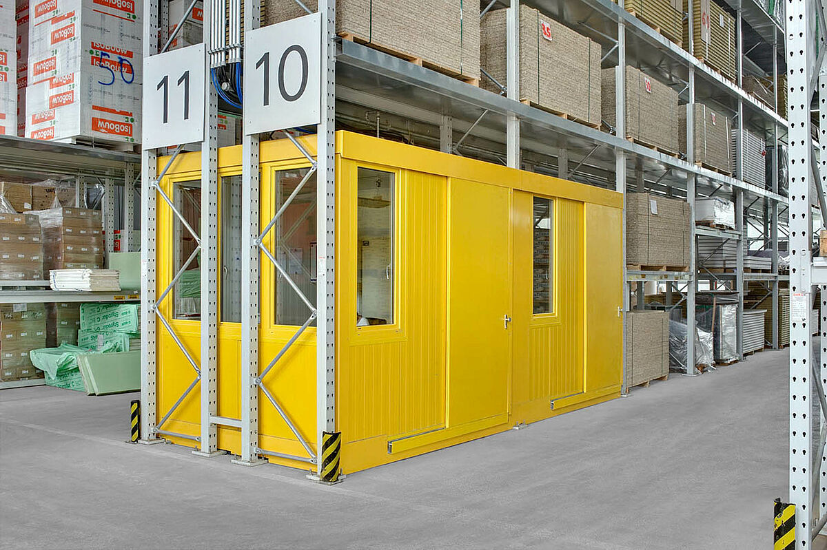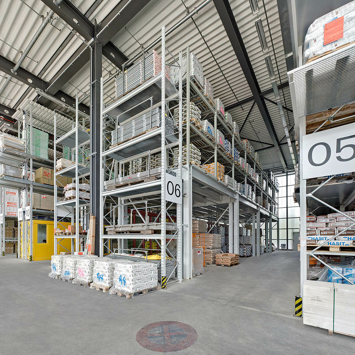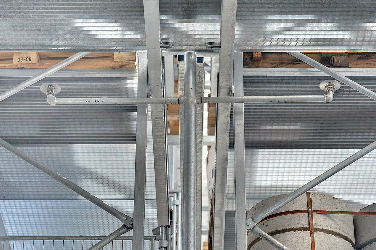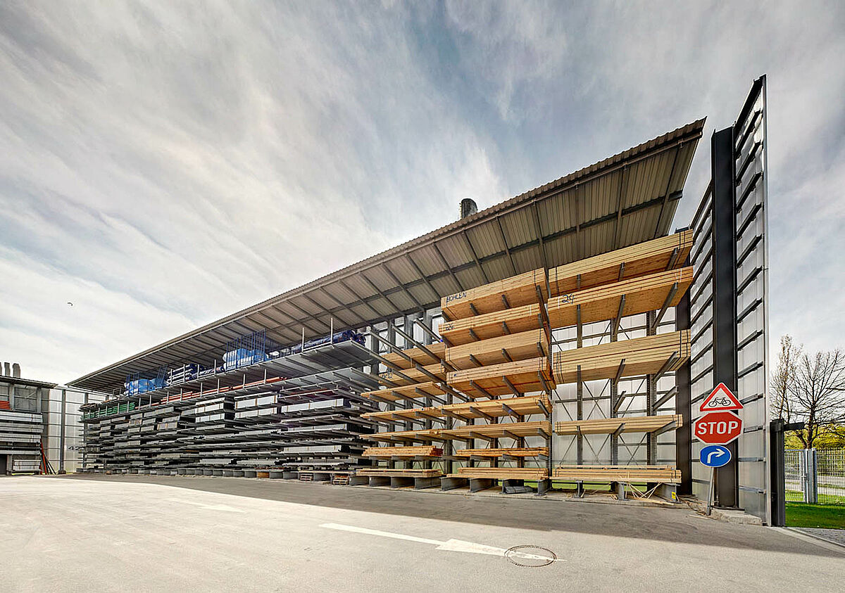 Sono stati scelti ad es. scaffali con bracci a sbalzo in acciaio zincato a caldo per l'area esterna, dove vengono conservati i prodotti come tubi di scarico, lastre in cemento e palancole di legno. Gli scaffali con bracci a sbalzo sono parzialmente coperti e dotati di griglie metalliche per il supporto delle merci. Uno degli ostacoli principali, in questo caso specifico, era la disposizione obliqua della struttura del tetto, resa necessaria dalla forma del terreno.
