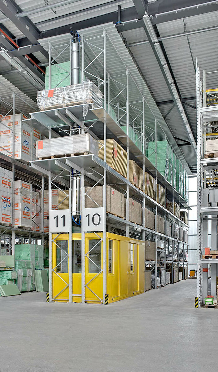 Tra gli scaffali per pallet OHRA ha anche integrato una piattaforma con scaffali per pallet applicati. La piattaforma ha una lunghezza di 22.500 mm e un'altezza di 4.500 mm. La distanza tra i pilastri è di circa 5.600 mm. Se al di sotto della piattaforma è stato creato un c.d. magazzino a blocchi, la parte superiore della piattaforma può essere dotata di ulteriori scaffali per pallet.