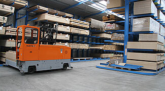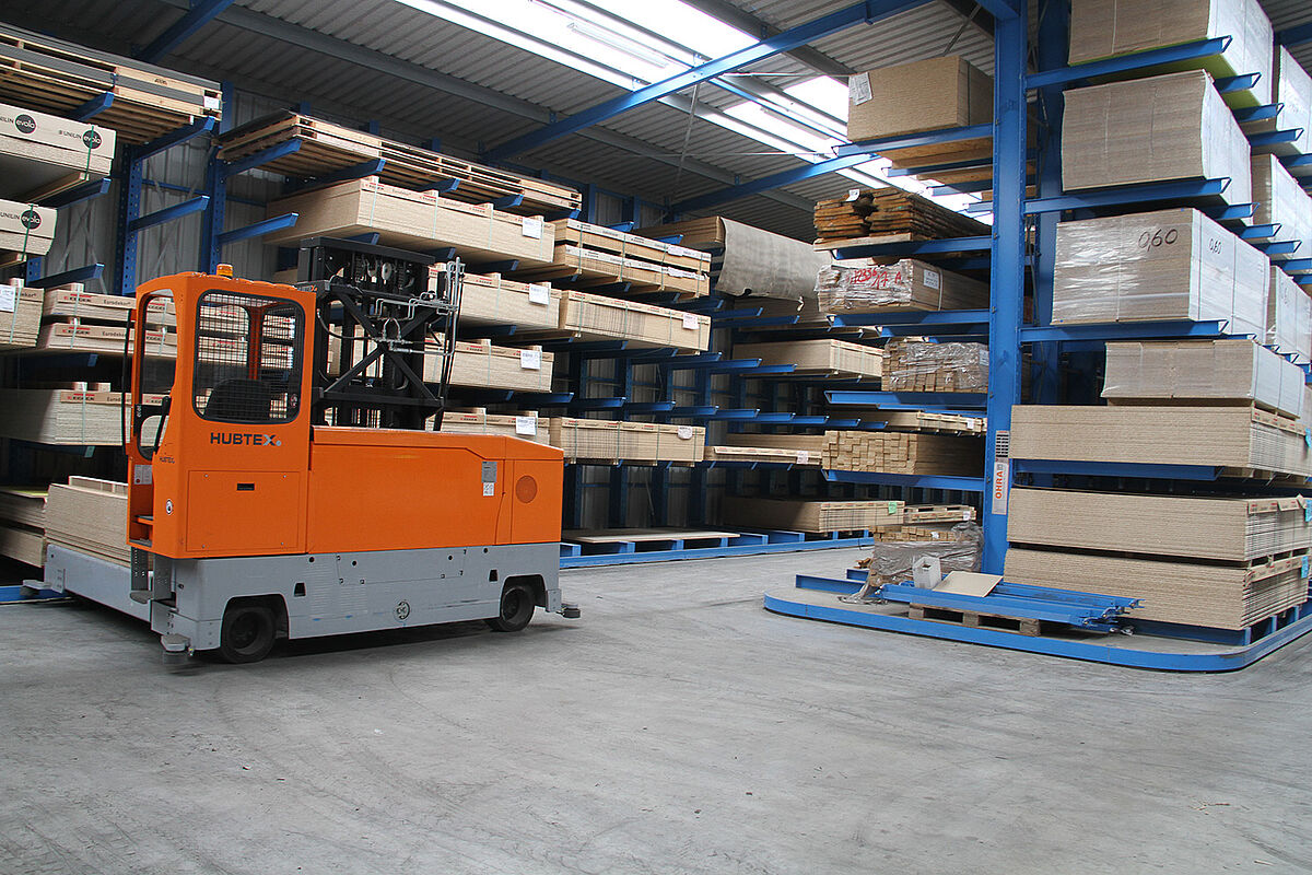 È stato quindi creato un padiglione di 38 metri di lunghezza, le cui pareti esterne sono composte rispettivamente da scaffalature cantilever unilaterali. Inoltre è stata disposta un’altra scaffalatura cantilever al centro delle due scaffalature laterali. I binari di guida consentono l’uso di un carrello elevatore laterale a più vie anche in presenza di corsie strette. Grazie agli scaffali personalizzati con altezze di 5,5 metri, 6,3 metri e 7,1 metri è stato possibile adattare il padiglione in modo ottimale all’ambiente. Ogni parte dei cantilever, lunghi 1850 millimetri, sopporta un carico che arriva fino a 600 chili. I cantilever non sono avvitati o saldati, ma vengono agganciati in modo flessibile alle colonne degli scaffali tramite una griglia di 100 millimetri. In questo modo possono cedere agli urti.