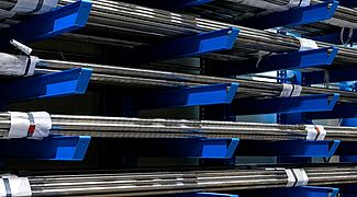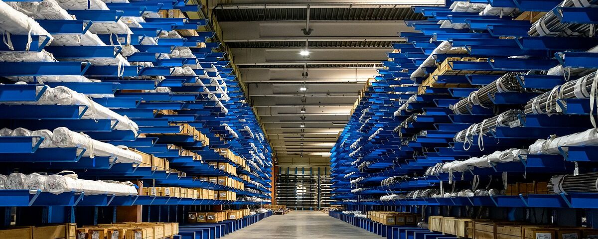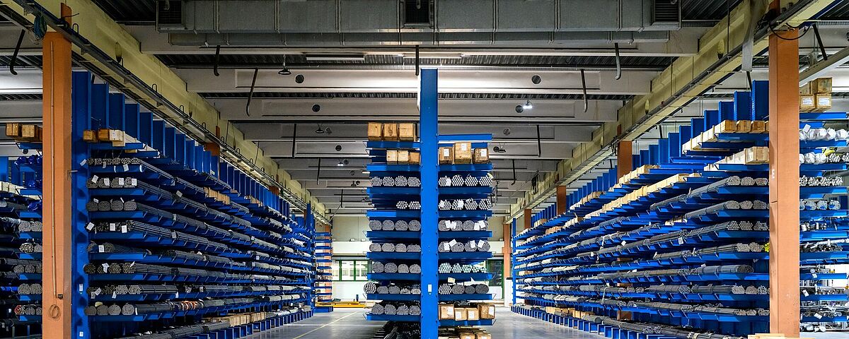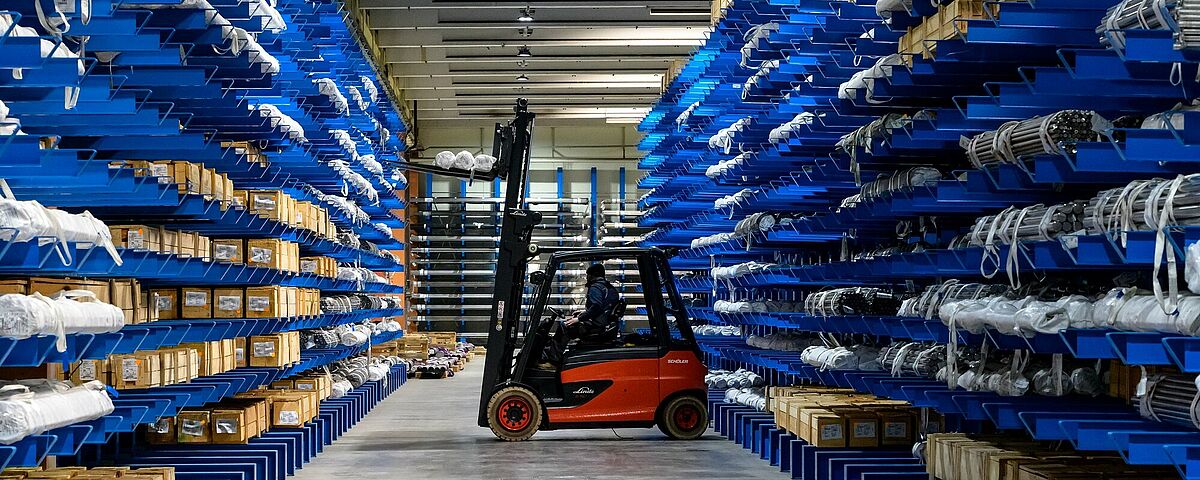 Per questo, l’utilizzo di elevatori ha costituito la base nella progettazione del nuovo magazzino per merci lunghe: i prodotti in acciaio inossidabile e in acciaio lucido dovevano essere stoccati nei cantilever in formati lunghi e in fasci della lunghezza di 3-6 metri. In questo modo, con il carrello elevatore è possibile accedere in modo mirato e rapido al singolo articolo. Dovevano essere impiegati carrelli elevatori standard da 5 tonnellate, che possono agevolmente movimentare un carico massimo di 4 tonnellate. Ogni compartimento dello scaffale doveva poter essere riempito con un carico del carrello elevatore, per mantenere il processo più snello possibile. L’altezza di alzata da raggiungere in sicurezza è stata stabilita da Wiedmann a 5,5 metri.
