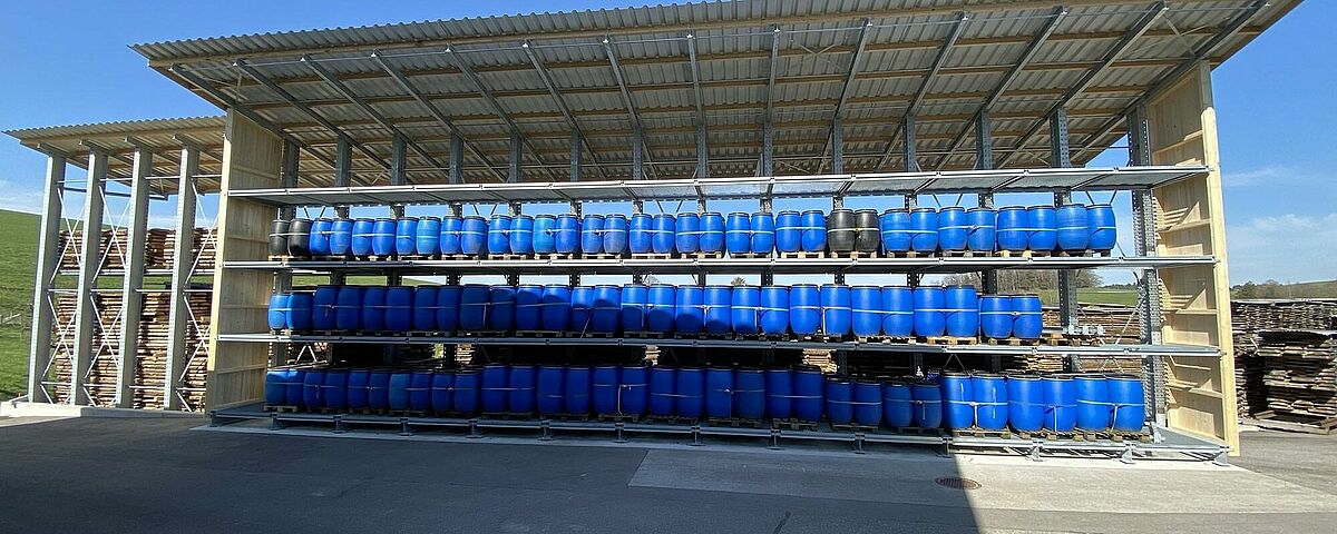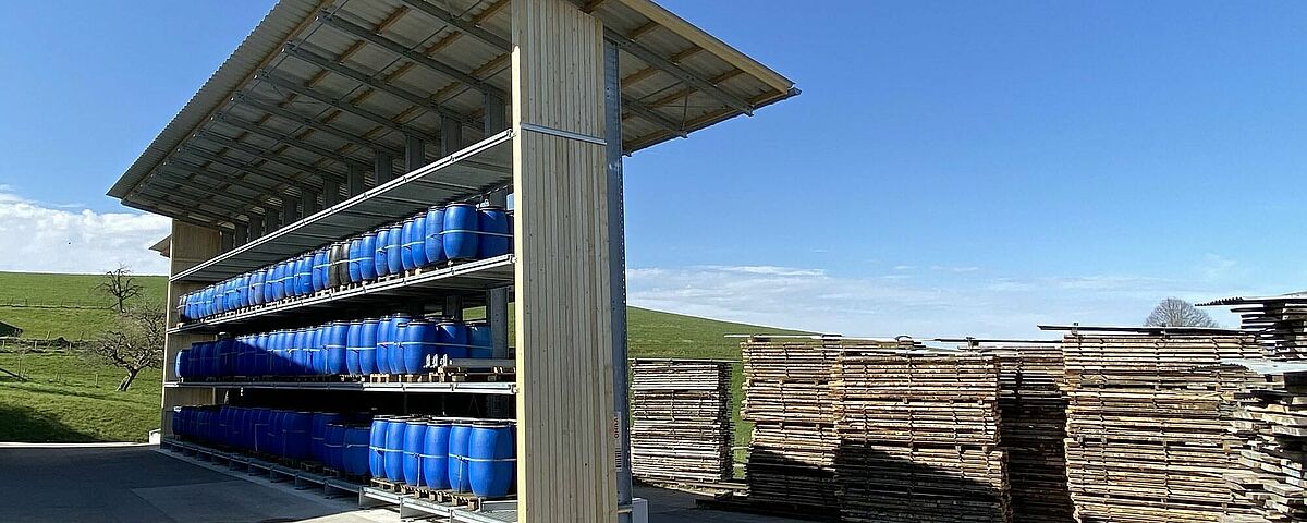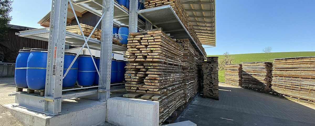 Fino ad ora, Nyfeler ha immagazzinato tavole di faggio, che la falegnameria utilizza per la produzione delle piste per biglie CUBORO, così come la legna da ardere e altri oggetti accatastati all'aperto. Gli europallet utilizzati per questo scopo si deterioravano costantemente, dando luogo a pile pericolosamente inclinate. Gli articoli utilizzavano molto spazio nella loro sistemazione e per proteggerli dalle intemperie, Nyfeler utilizzava teloni di copertura che comportavano importanti perdite di tempo. Ultimo ma non meno importante, il magazzino occupava un'area eccessivamente ampia.