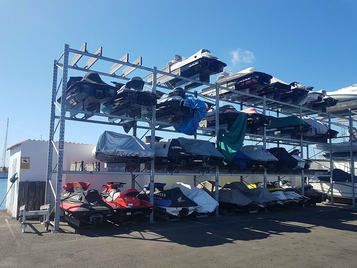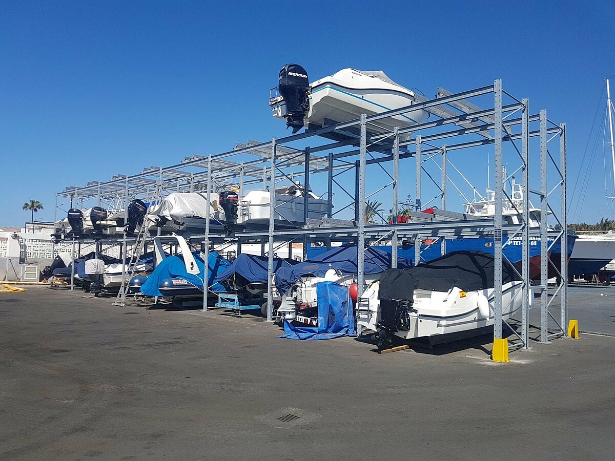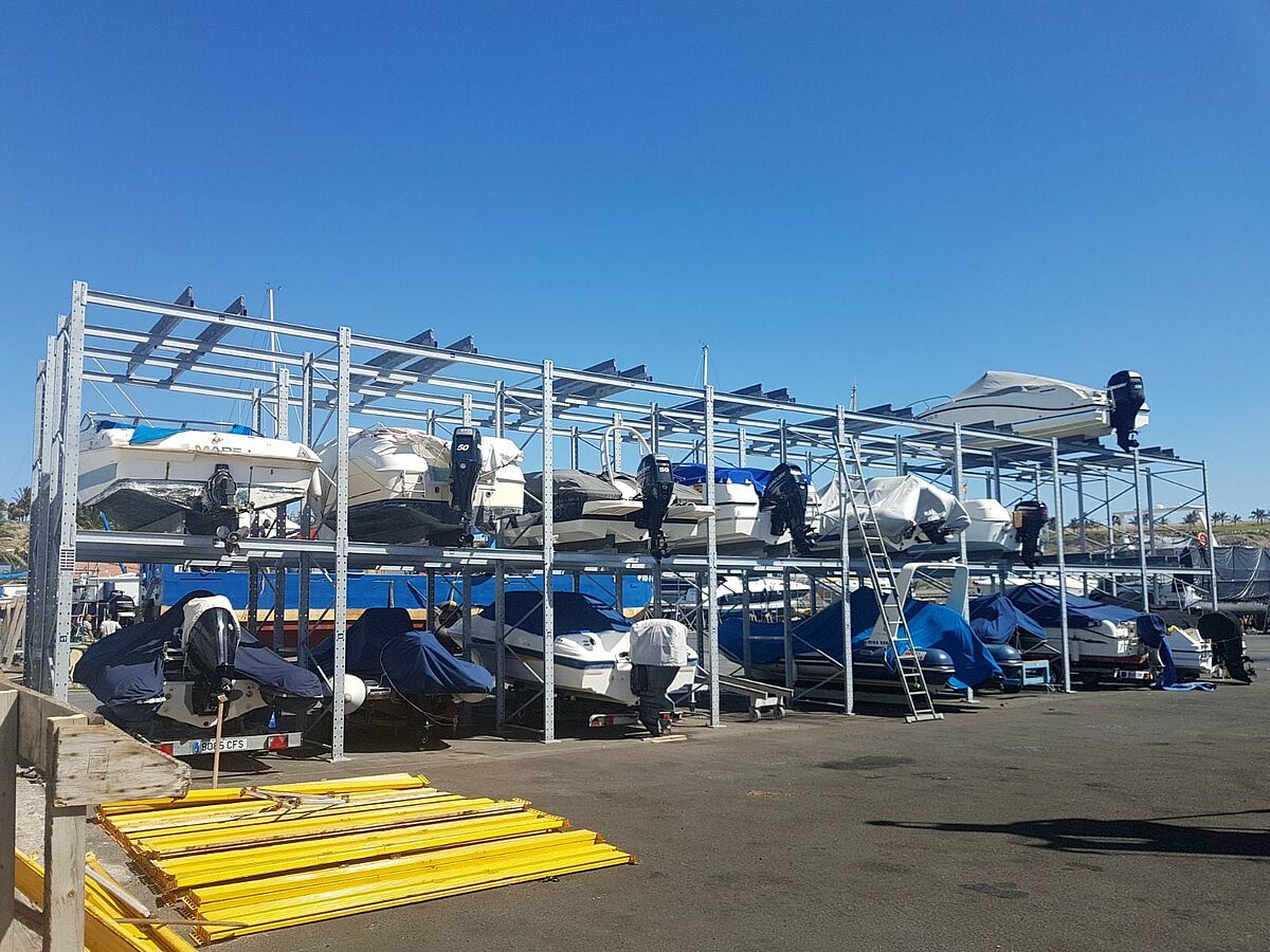 Il sistema di scaffalatura si basa su rack per pallet OHRA, adattati alle specifiche esigenze del porto turistico e alle dimensioni delle barche. Per le barche più grandi sono state installate tre linee di cremagliera a doppia fila. I ripiani a due piani offrono una profondità di stoccaggio di 3,8 metri. Per il rimessaggio di moto d'acqua e barche più piccole in modo poco ingombrante, è stata installata anche una fila di scaffali a una fila di tre piani. I criteri determinanti che hanno spinto il porto turistico ad affidarsi agli scaffali di OHRA sono state la qualità dei materiali utilizzati e la robustezza: OHRA utilizza solo acciai strutturali standard solidi e laminati a caldo per gli elementi portanti dei suoi scaffali. Questo non solo garantisce la necessaria capacità di carico, ma sfida anche l'impegnativo ambiente marino di Pasito Blanco. La zincatura supplementare a caldo garantisce che i ripiani non perdano la loro capacità di carico anche dopo anni di utilizzo all'aperto e rendono giustizia all'aspetto ben curato delle imbarcazioni stoccate. E quando è il momento di uscire di nuovo in mare, basta chiamare il porto turistico e la barca sarà messa a disposizione per nuove navigazioni.