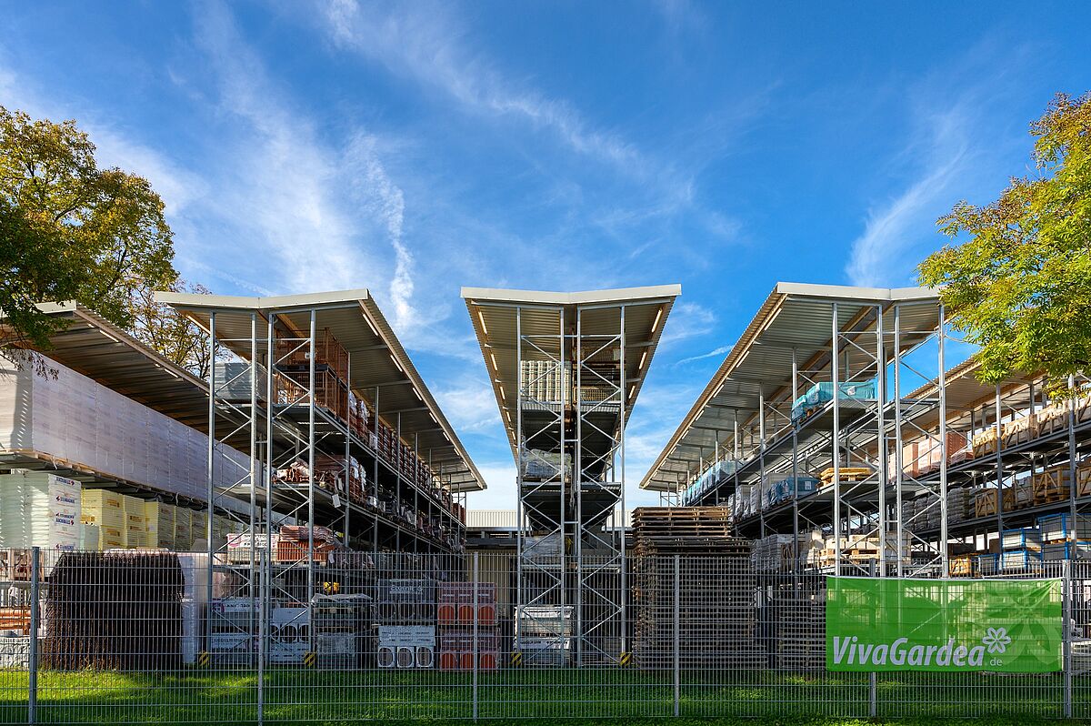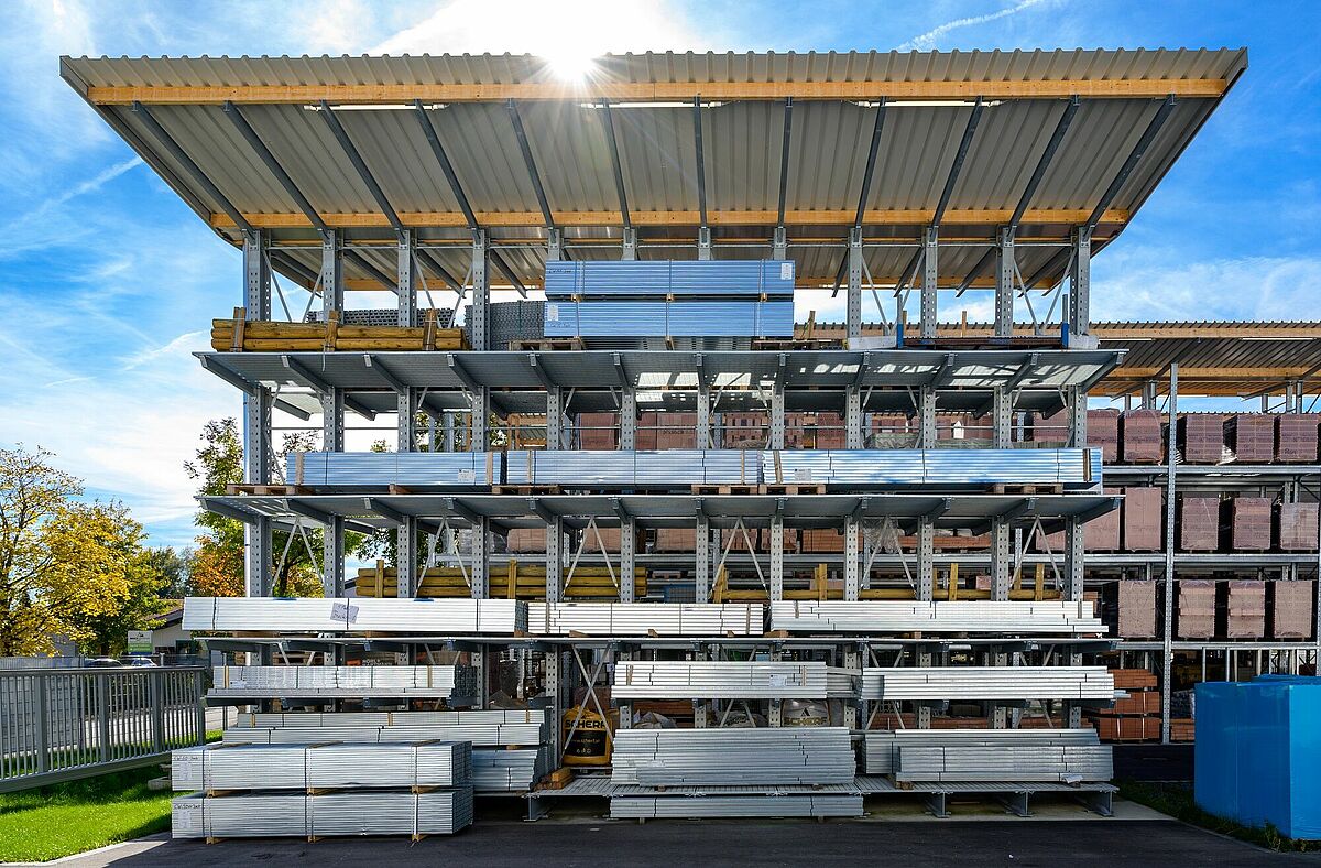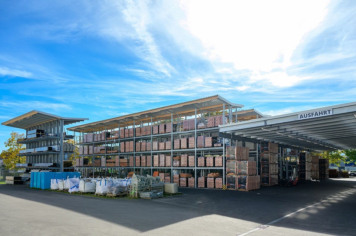 Altri materiali possono essere immagazzinati nelle cinque file di scaffalature lunghe 28 metri dell'area di stoccaggio esterna come pure nel capannone nelle scaffalature autoportanti, anche qui sono state installati cantilever e portapallet. Ogni fila di scaffalature sostiene il tetto con una sporgenza di un metro. Tra il capannone delle scaffalature e l'area di stoccaggio esterna si estende la corsia dove la merce viene messa a disposizione dei clienti. La corsia è coperta da un tetto di 13 metri di larghezza che collega il capannone con le scaffalature autoportanti e l'area di stoccaggio esterna.