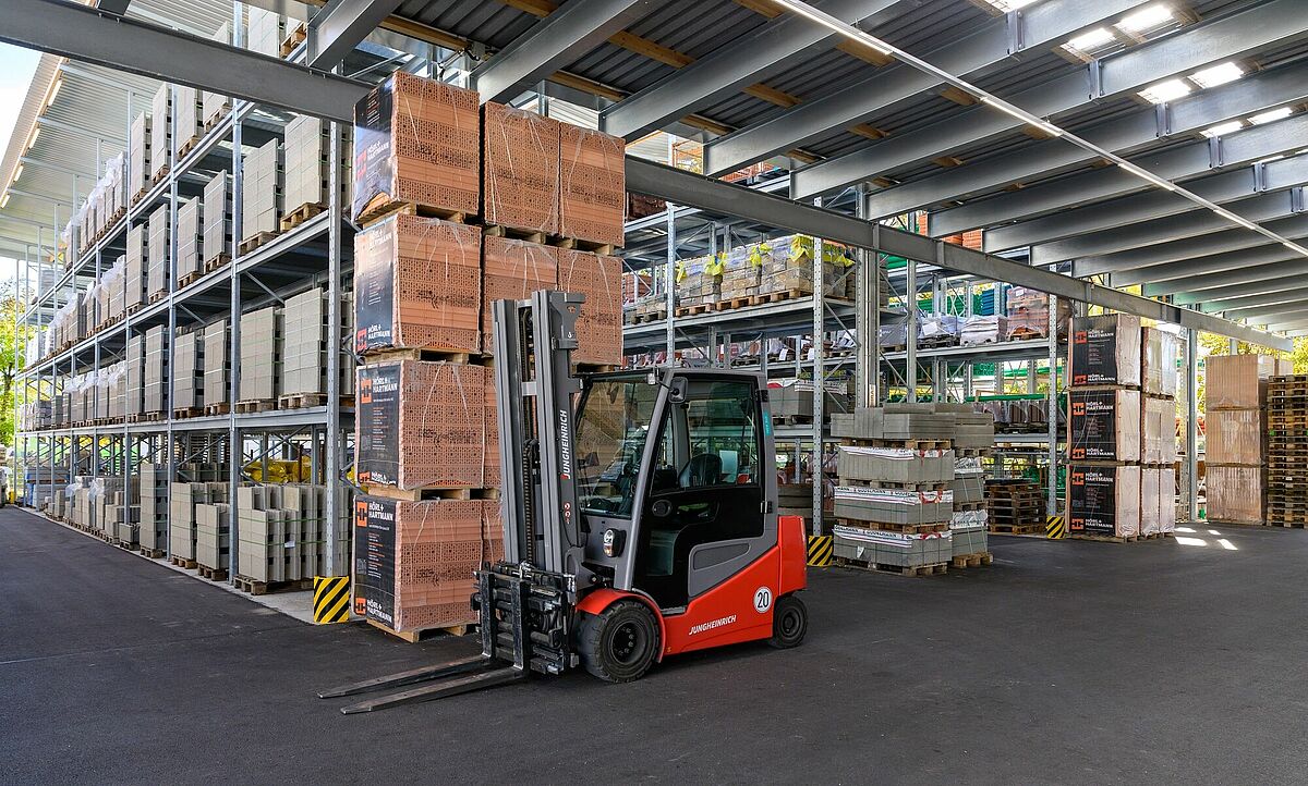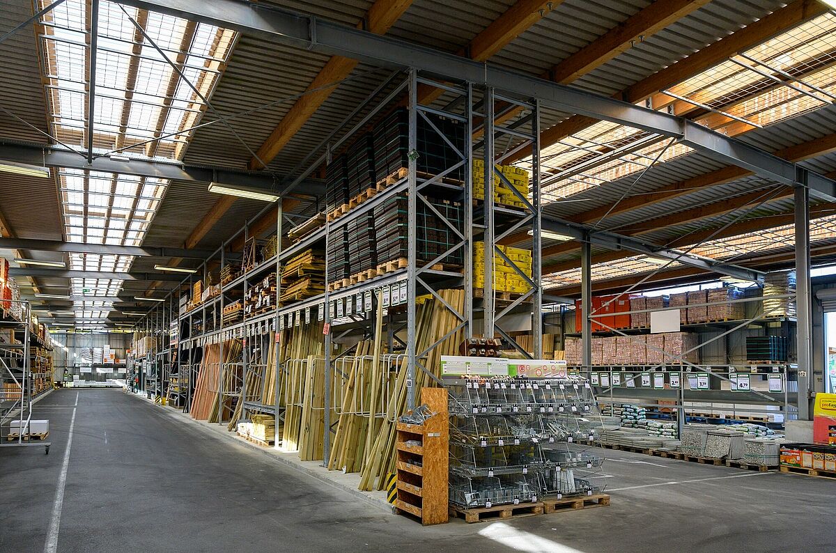 Le scaffalature nel capannone e nell'area esterna sono caratterizzate da un'elevata capacità di carico: I bracci cantilever lunghi 1.250 millimetri possono sopportare carichi fino a 1,2 tonnellate, i carichi nel  portapallet arrivano fino a 4,5 tonnellate. Per poter immagazzinare in modo flessibile la varietà di articoli trattati da Baucentrum Schneider, OHRA ha dotato le scaffalature di griglie - così tutto, dai sacchi di cemento agli europallet, può essere immagazzinato in qualsiasi punto dello scaffale.