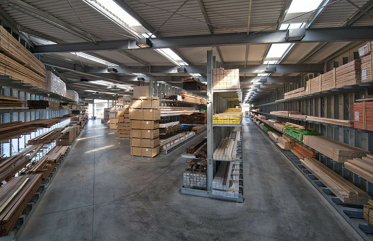 Padiglione attrezzato con scaffalature per il commercio del legname