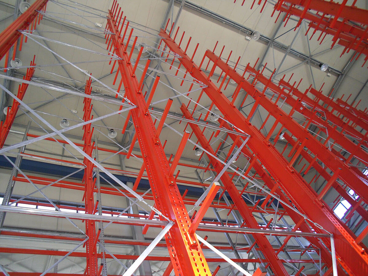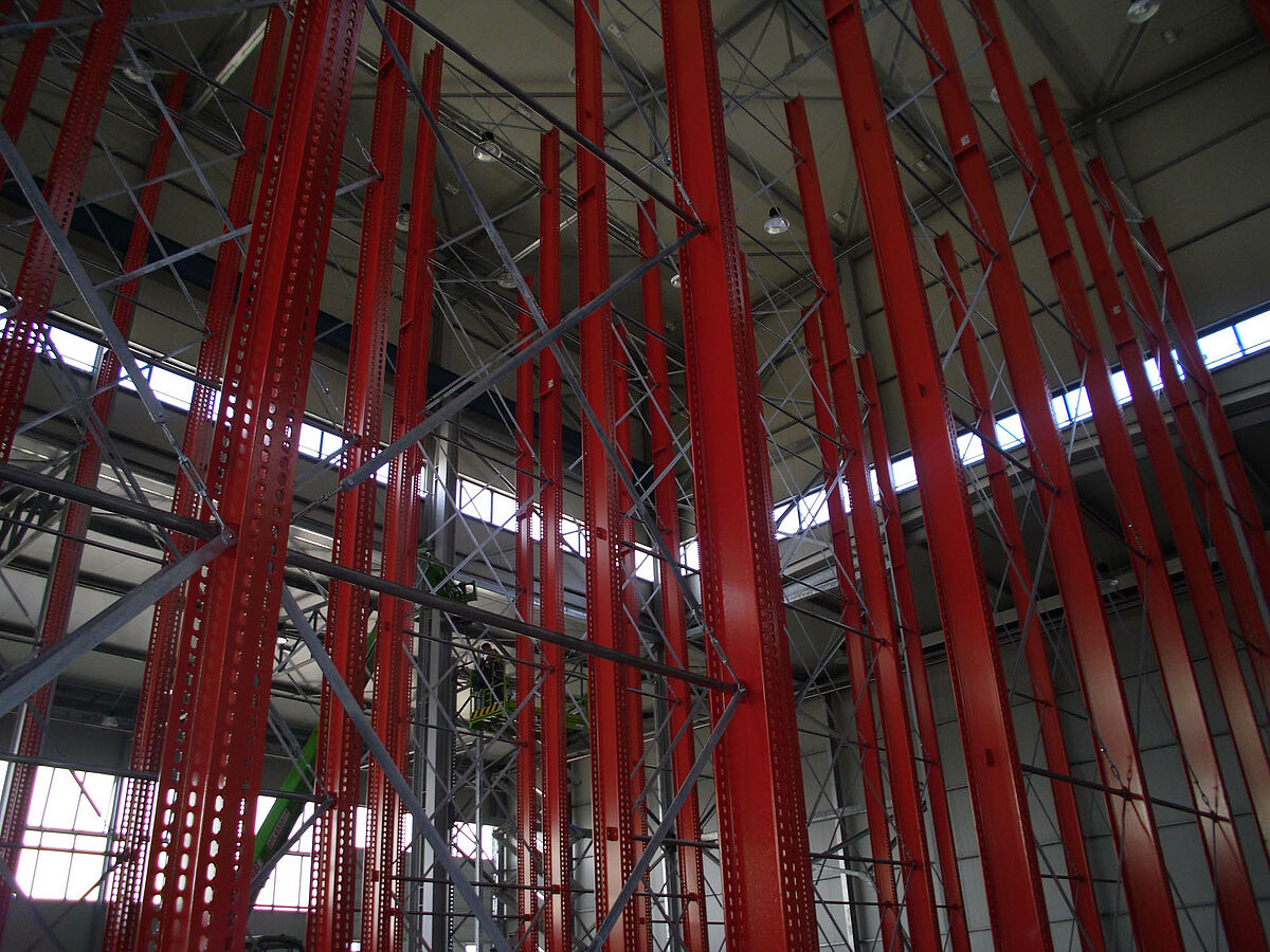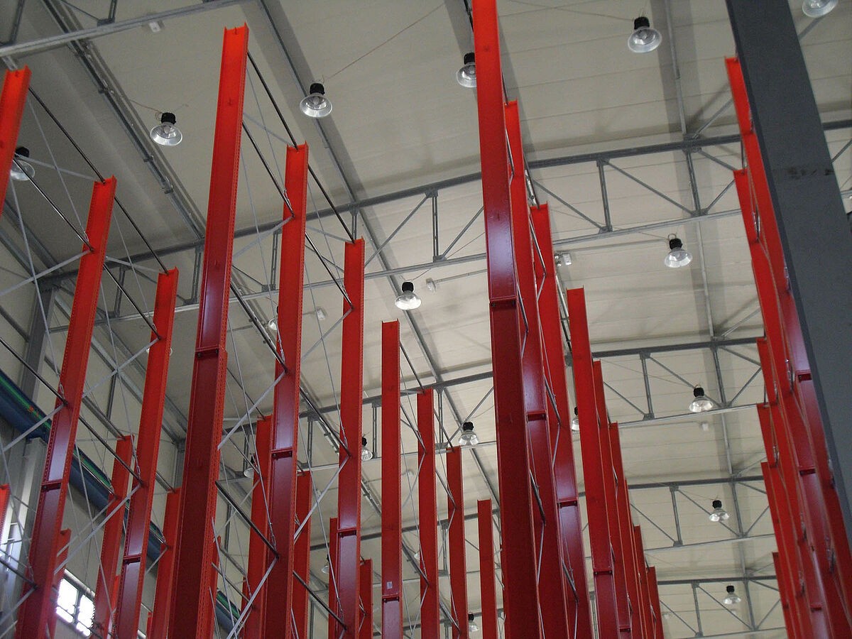 In tale contesto i progettisti si sono avvalsi dei solidi montanti degli scaffali OHRA realizzati con robusti profilati d'acciaio a parete piena. In questo modo è stato così possibile sfruttare completamente l'intera altezza del fabbricato. Nonostante l'altezza di ben 13,7 metri, l'installazione dei montanti è libera per cui essi non costituiscono alcun impedimento per l'impianto gru. Ciononostante la massima flessione consentita di 1/200 alla sommità dei montanti non viene mai superata, nemmeno a pieno carico. Inoltre, grazie ai montanti particolarmente stabili rispetto alla progettazione iniziale e alle offerte della concorrenza - è stato possibile integrare nel sistema un'ulteriore fila di scaffali unilaterale. Ciò comporta un aumento del 10 percento circa della capacità di stoccaggio.