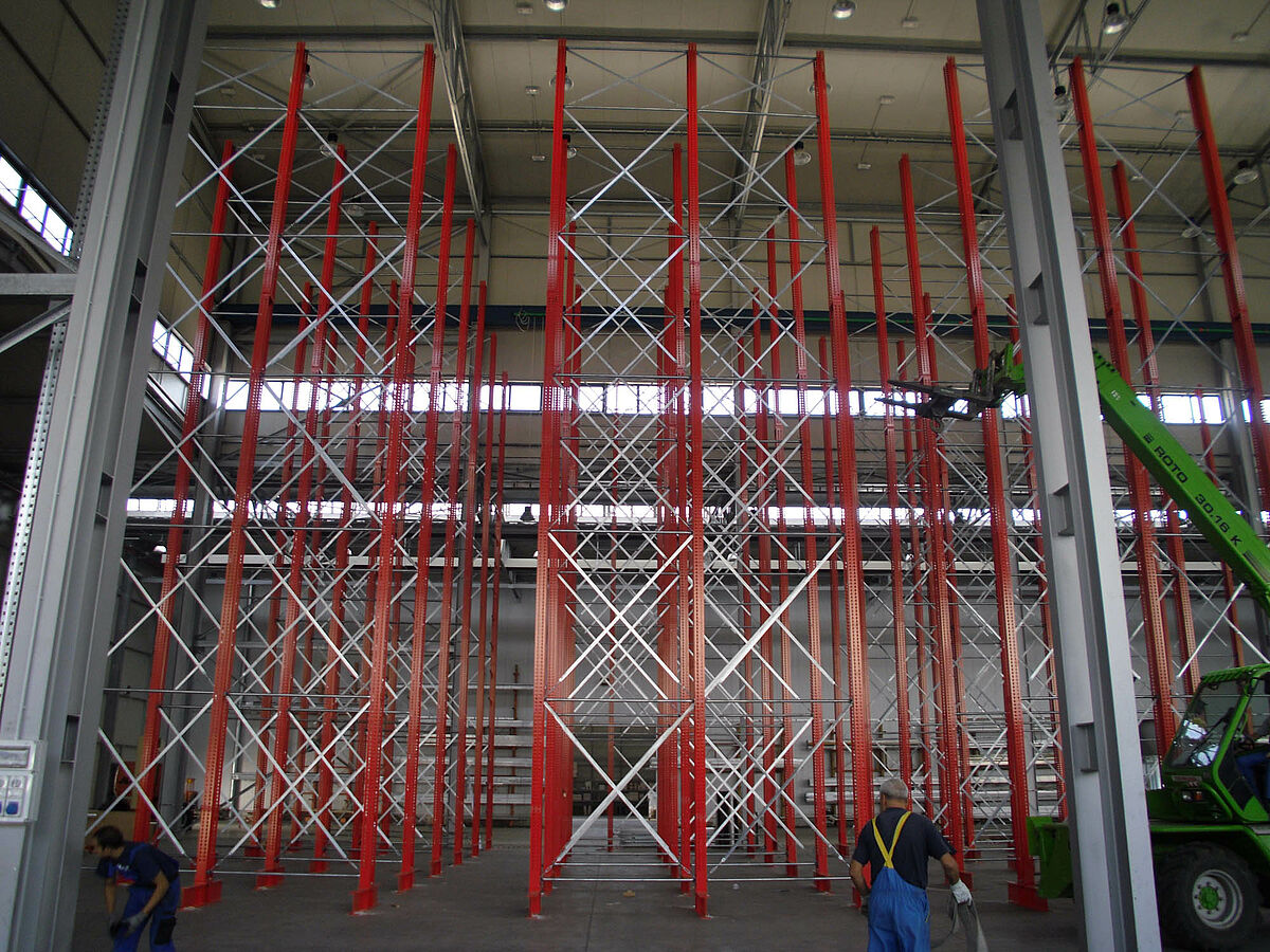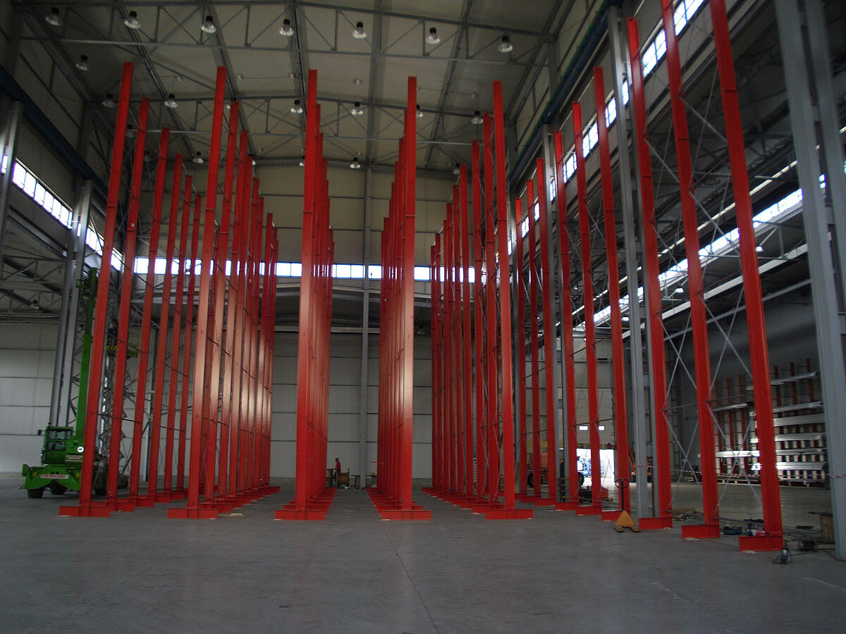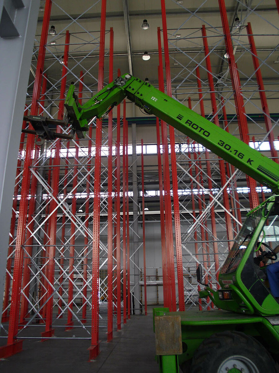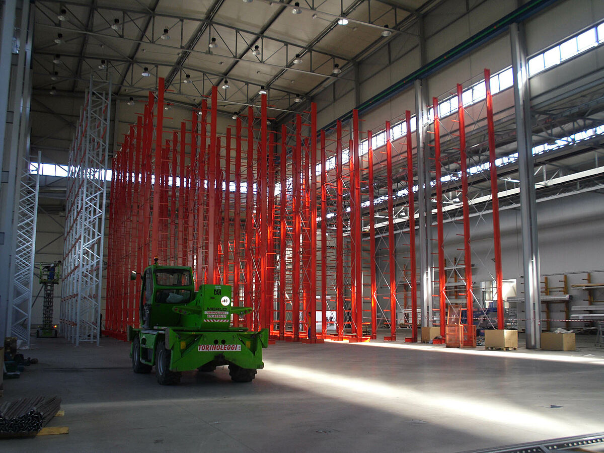 In tale contesto i progettisti si sono avvalsi dei solidi montanti degli scaffali OHRA realizzati con robusti profilati d'acciaio a parete piena. In questo modo è stato così possibile sfruttare completamente l'intera altezza del fabbricato. Nonostante l'altezza di ben 13,7 metri, l'installazione dei montanti è libera per cui essi non costituiscono alcun impedimento per l'impianto gru. Ciononostante la massima flessione consentita di 1/200 alla sommità dei montanti non viene mai superata, nemmeno a pieno carico. Inoltre, grazie ai montanti particolarmente stabili rispetto alla progettazione iniziale e alle offerte della concorrenza - è stato possibile integrare nel sistema un'ulteriore fila di scaffali unilaterale. Ciò comporta un aumento del 10 percento circa della capacità di stoccaggio.