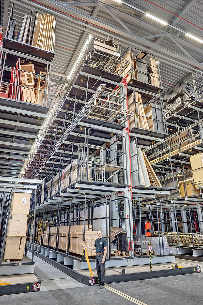 Gli 8 scaffali a mensola mobili doppi di circa 60 m di lunghezza hanno una portata ciascuno di 180 to. I carrelli porta quinte vengono caricati e scaricati tramite un muletto a quattro vie con cabina sollevata.