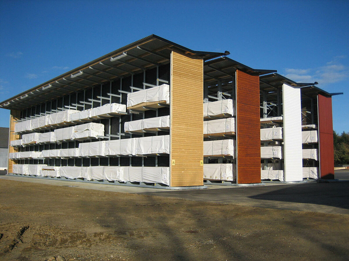 Il legno accatastato non trattato in passato era disposto in cortile a cielo aperto. A tale scopo si utilizzata un’ampia superficie e la gestione dei profili in legno richiedeva molto tempo. Il cliente quindi desiderava ottenere una possibilità di stoccaggio da creare nelle dirette vicinanze del centro di lavorazione del legno nello stabilimento di produzione presente. Al contempo il nuovo magazzino doveva essere realizzato occupando il minor spazio possibile per contenere i costi relativi alla pavimentazione in cemento e della copertura. Doveva essere prevista inoltre la possibilità di ampliamento per il futuro senza dove intervenire radicalmente sulla struttura.
