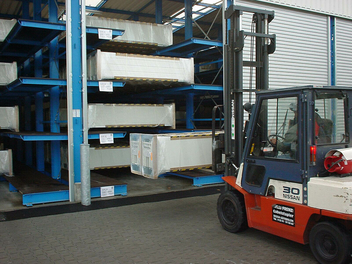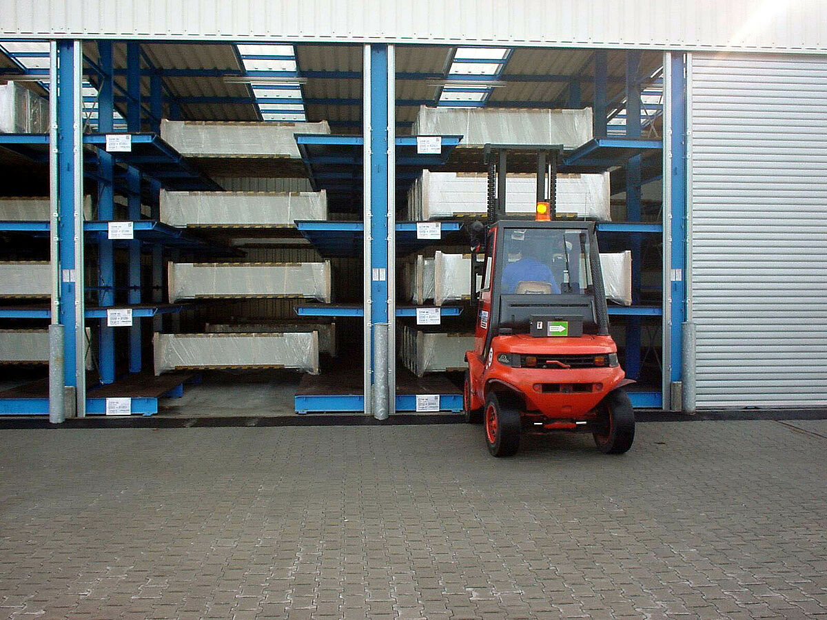 Con questo sistema i comparti del cantilever servono praticamente da superfici di scarico. Secondo il tipo, le porte vengono smistate nei rispettivi comparti e quindi immagazzinate con grande risparmio di spazio. Con poche manovre il carrello elevatore può svuotare il carico di un intero comparto e caricarlo sul camion.