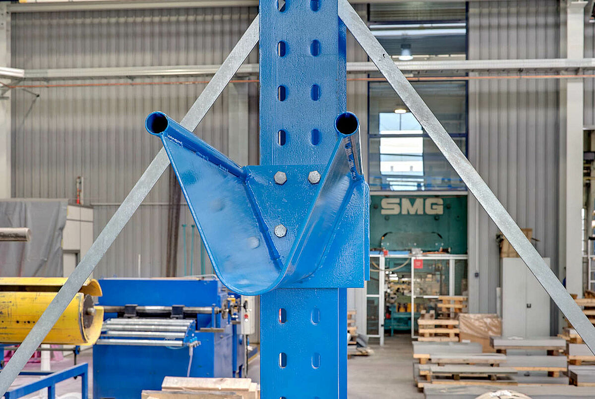 Per l'immagazzinamento delle bobine THERMOWAVE si è dotata dei robusti scaffali con bracci a sbalzo di OHRA. Il braccio per bobina, appositamente progettato da OHRA, ha una portata max di 15 ton per braccio ed è quindi particolarmente indicato per l'immagazzinamento di coil pesanti. L'attività di carico e scarico delle bobine avviene tramite un gancio telescopico a C. In questo modo le bobine sono trasportate direttamente dallo scaffale all'impianto di taglio, dove vengono poi realizzate le piastre delle dimensioni desiderate, che saranno successivamente lavorate, ad esempio modellate tramite una pressa.