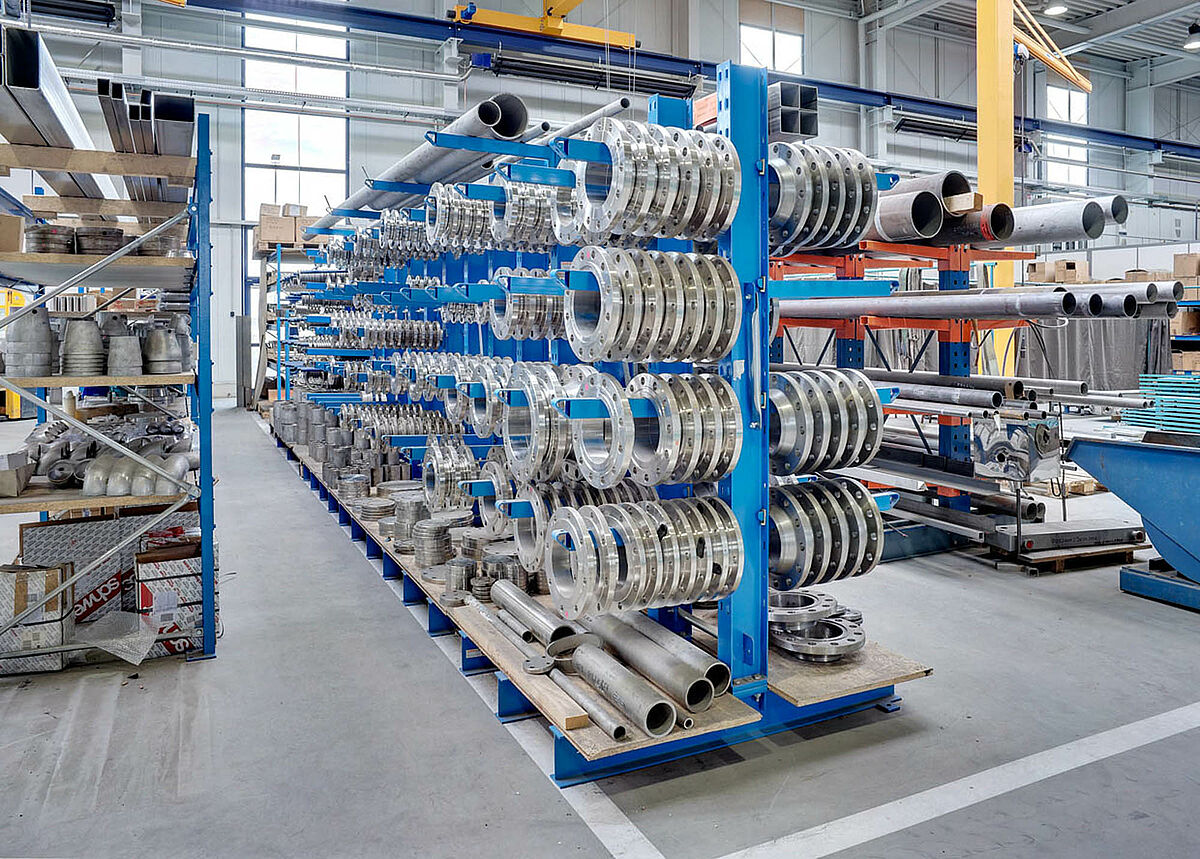 Oltre al materiale grezzo, nei robusti scaffali a bracci vengono immagazzinati anche altri utensili, come ad esempio le flange. Le flange sono necessarie per il collegamento allo scambiatore termico prodotto. Su ogni dispositivo sono montate 4 flange e quindi in magazzino vi è sempre una certa disponibilità di tali utensili.