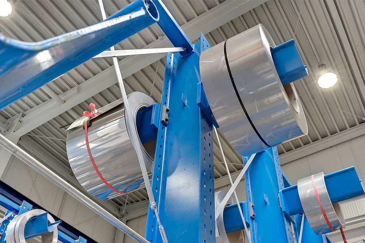 Per la produzione di questi dispositivi vengono impiegate lamiere d'acciaio, fornite sotto forma di bobine, che devono essere immagazzinate in attesa della successiva produzione. In funzione della loro struttura, le bobine sono caratterizzata da diverse larghezze fisse e quindi anche da pesi tra loro diversi.