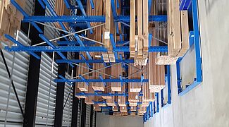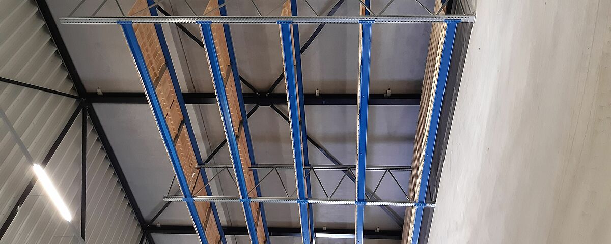 La realizzazione del magazzino a corsie strette garantisce un elevato grado di utilizzo dello spazio, mentre le guide alla base della scaffalatura facilitano le manovre dei carrelli elevatori nelle corsie. Grazie alla costruzione ad alte prestazioni in profili d'acciaio laminati a caldo ad anima piena, le scaffalature possono essere utilizzate anche per sfruttare appieno l'altezza del locale: I portapallet raggiungono un'altezza di 6.600 millimetri, le scaffalature cantilever 6.080 millimetri.