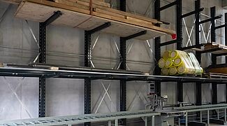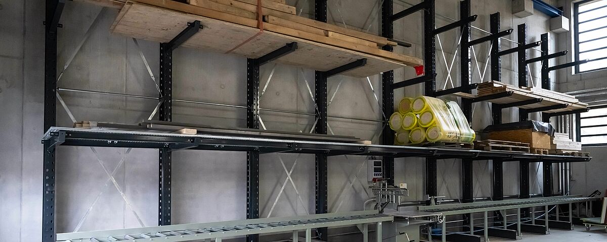 Le scaffalature progettate per il nuovo magazzino sono costituite da cantilever zincato a caldo lunga quasi 16 metri collocata esternamente. All’ interno sono stati installati cantilever da ca. 15 metri e da 3 metri. I cantilever, alti circa sette metri, consentono una capacità di stoccaggio superiore rispetto al magazzino della vecchia sede. Le mensole con portata fino a 1.000 kg, sono stati in parte dotate di rompitratta e ripiani in grigliato. Ciò permette lo stoccaggio di un'ampia gamma di tipi di legno, articoli e formati di pallet diversi. Inoltre, le mensole possono essere liberamente collocate alle altezze desiderate. Per lo stoccaggio di tavole di diverse dimensioni sono stati installati due scaffali verticali aggiuntivi, in cui le tavole vengono conservate in verticale, in modo da poter accedere alla materiale richiesto in modo rapido e semplice. Tutti gli scaffali interni sono stati verniciati a polvere in grigio antracite (RAL 7016) su richiesta di “Ihre Zimmerei”.