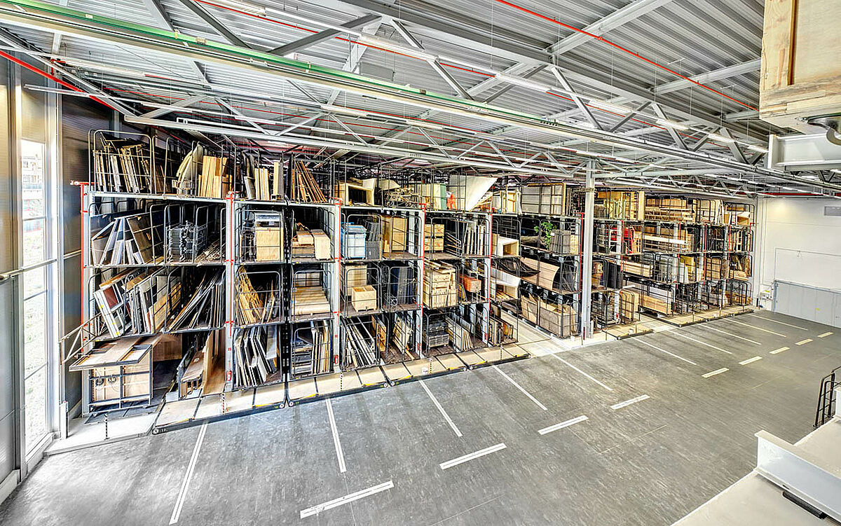 Per la realizzazione o modifica delle scene sono necessari molteplici materiali di misure e pesi diversi. Gli scaffali verticali garantiscono una capacità di carico elevata – specialmente per oggetti pesanti e voluminosi – e una movimentazione veloce nell’officina.