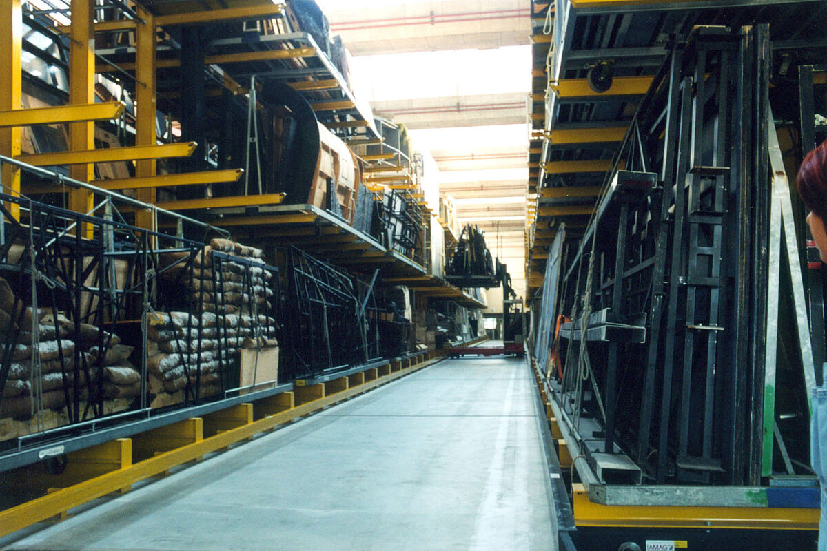 Recentemente, gli scaffali cantilever mobili si sono rivelati una soluzione economica speciale come scaffalatura infinita. Lo scaffale cantilever diventa, con l’aiuto di raccordi a braccio, un piano di appoggio omogeneo senza supporti, di profondità fino a 2,5m e di quasi qualunque lunghezza. A seconda dell’altezza del padiglione si hanno quindi 5-6 piani ampi.